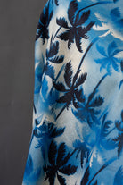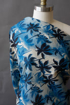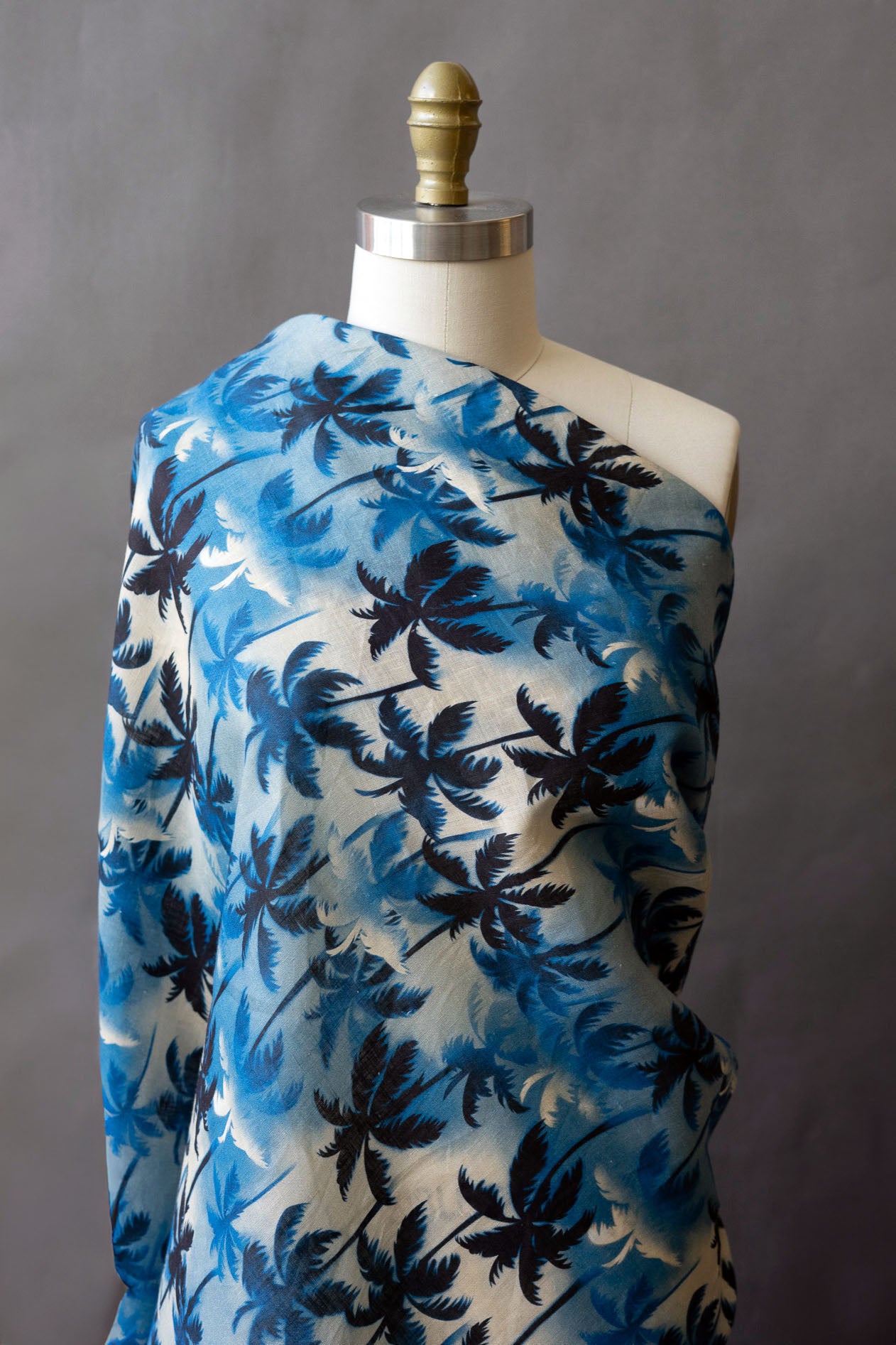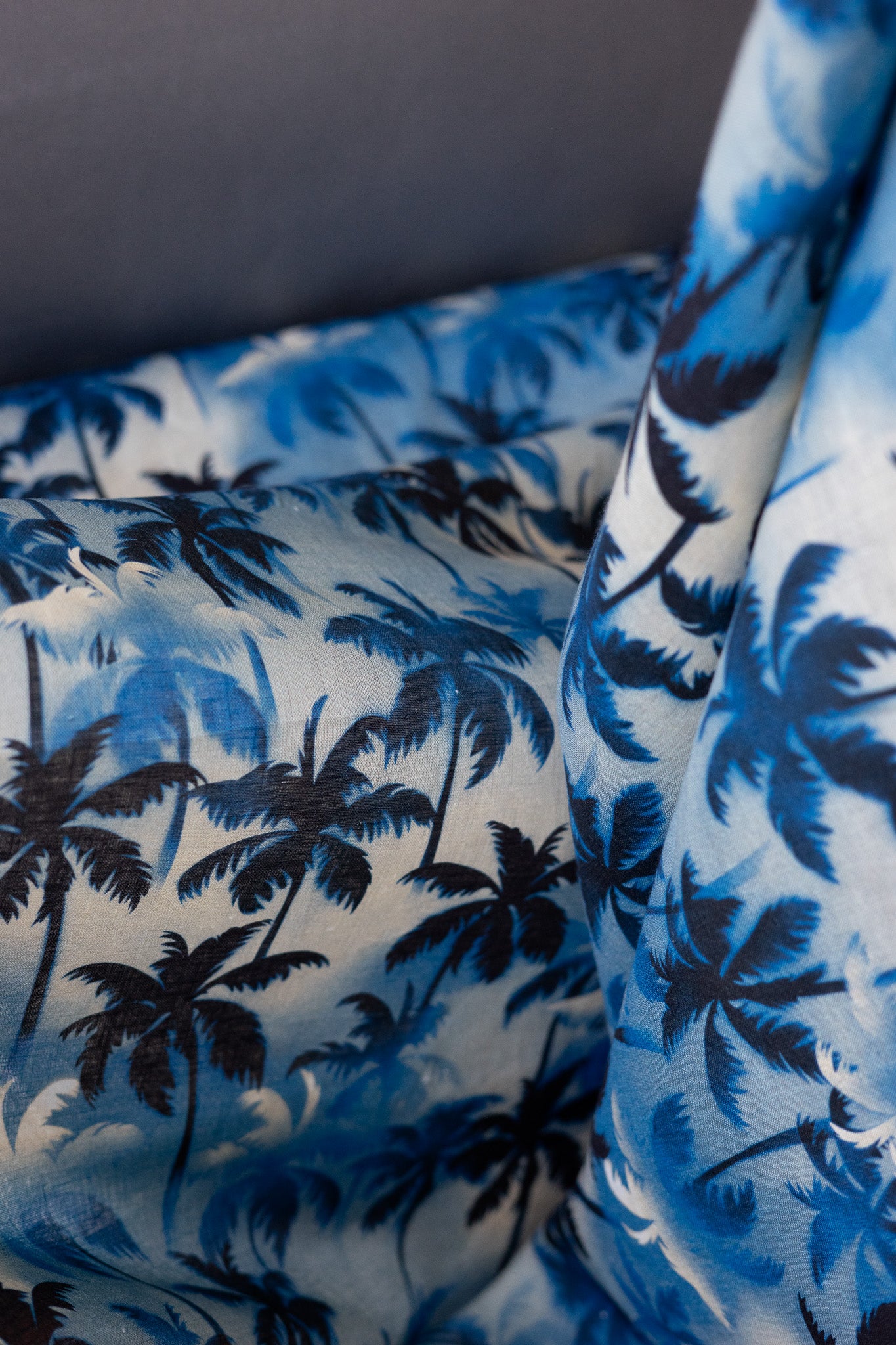 This moody tropical print features palm tree silhouettes over watercolor blues. It would be perfect for