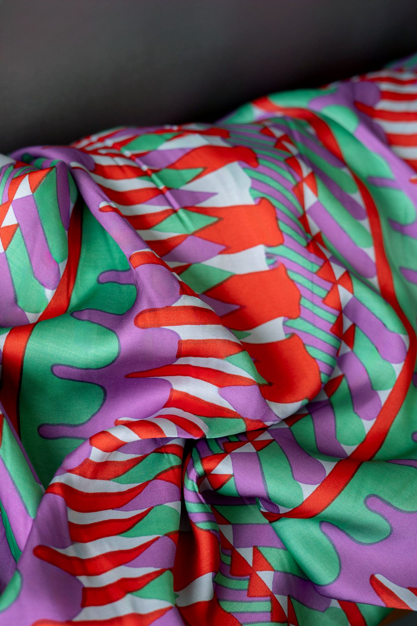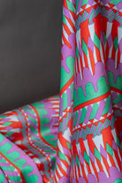 Make your next getaway outfit in this fun, vacation-inspired designer satin viscose. With a colorful geometric print, this drapey satin weave with a medium sheen is perfect for dresses, skirts, blouses, and scarves.