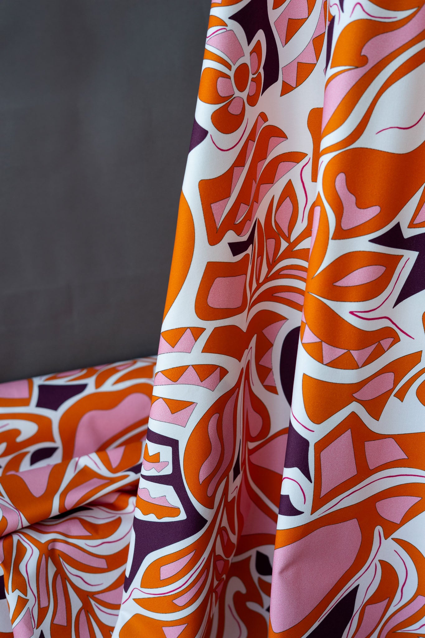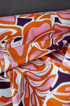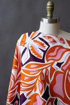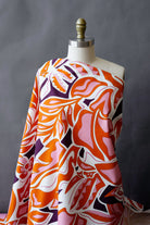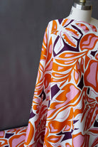 This fun geometric print includes floral-inspired shapes in orange, pink, eggplant, and cream. It would make a great structured dress or skirt, or a pair of summer shorts.