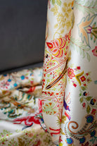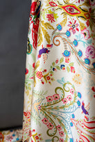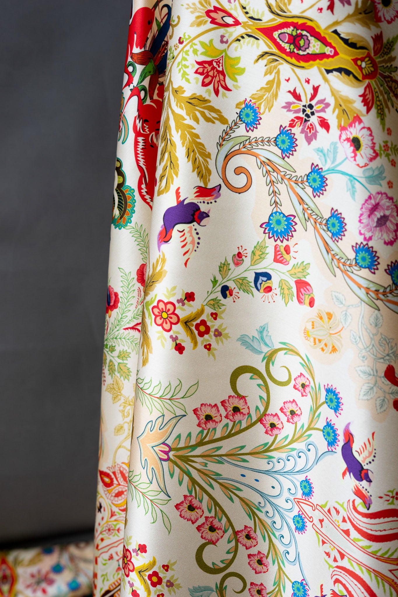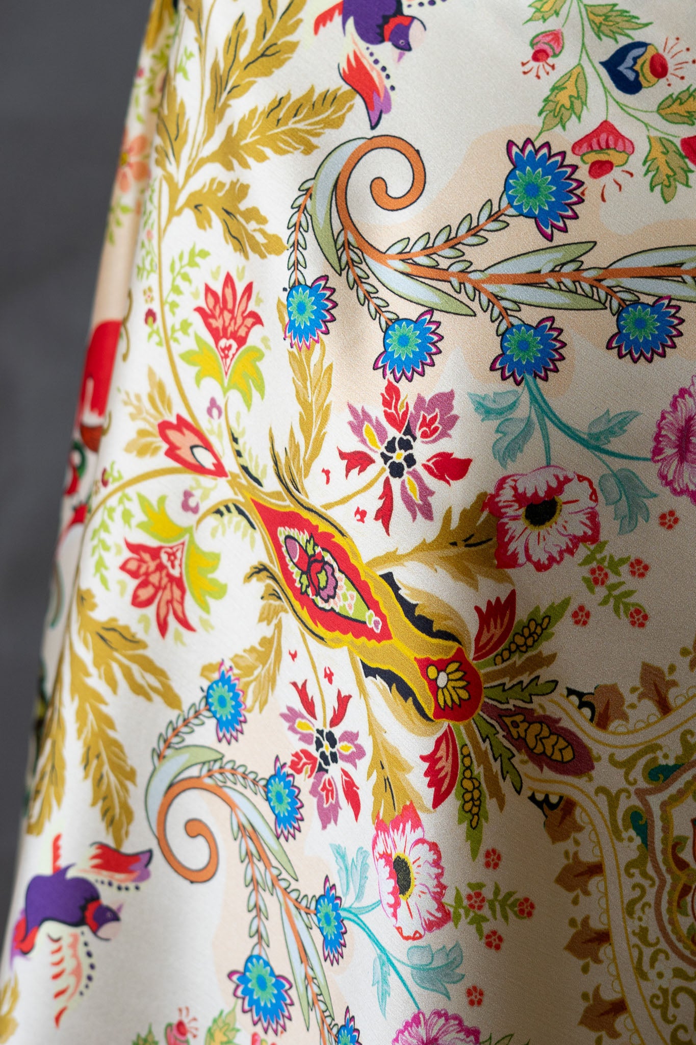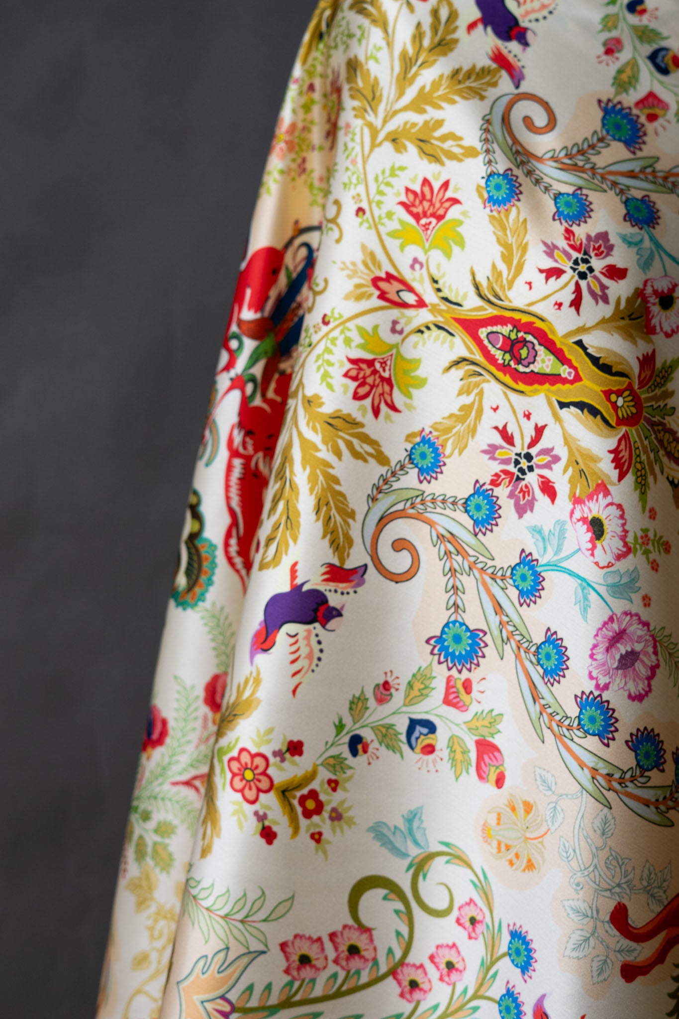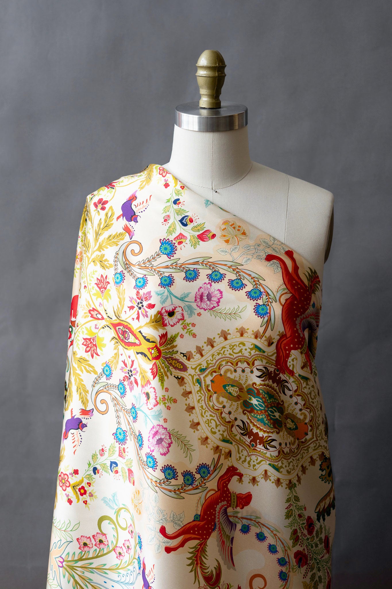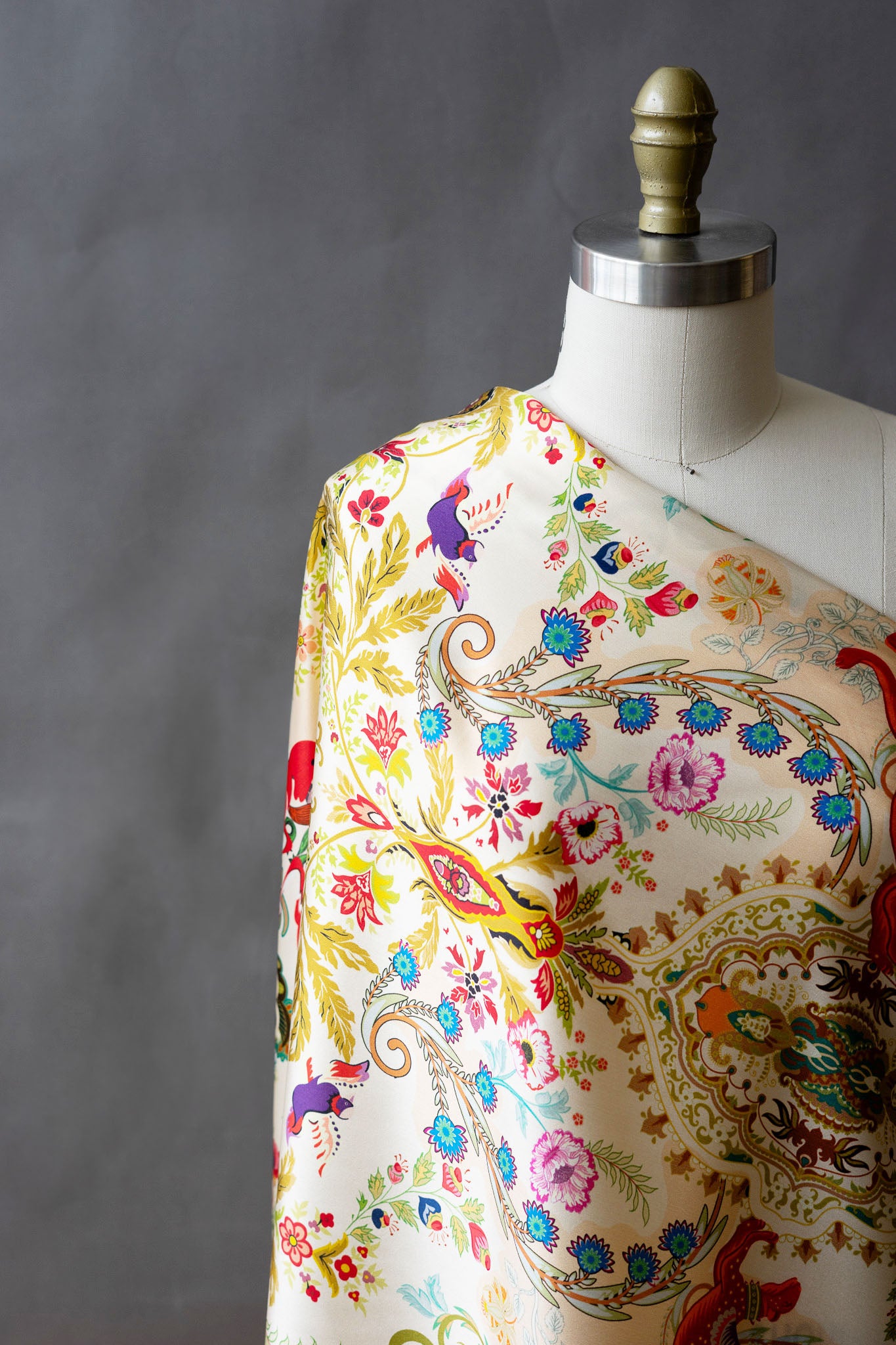 This whimsical Italian silk has a garden motif complete with mythical birds, twisting foliage, and a few winged wildcats for good measure. It would make a beautiful skirt, dress, or scarf.