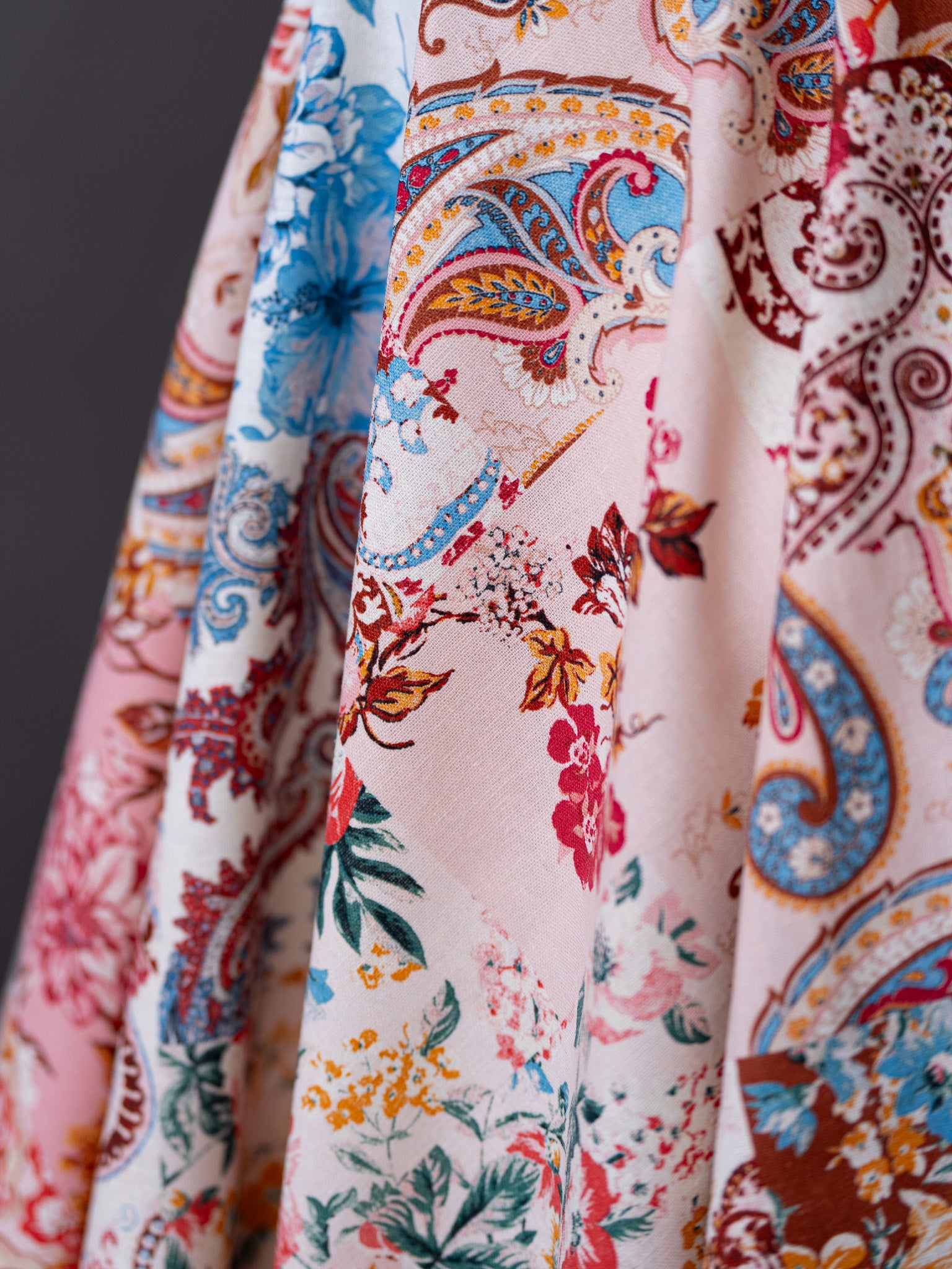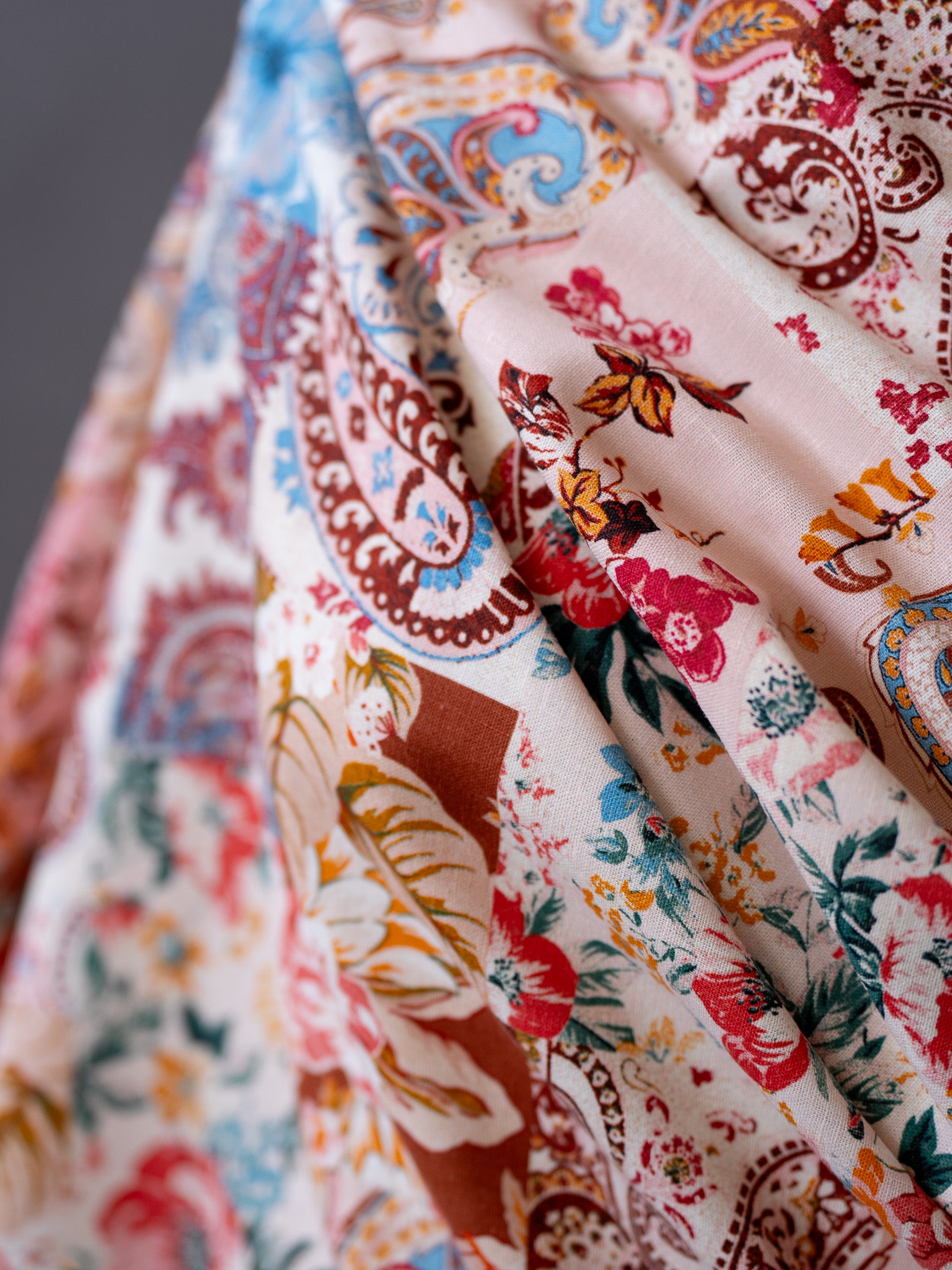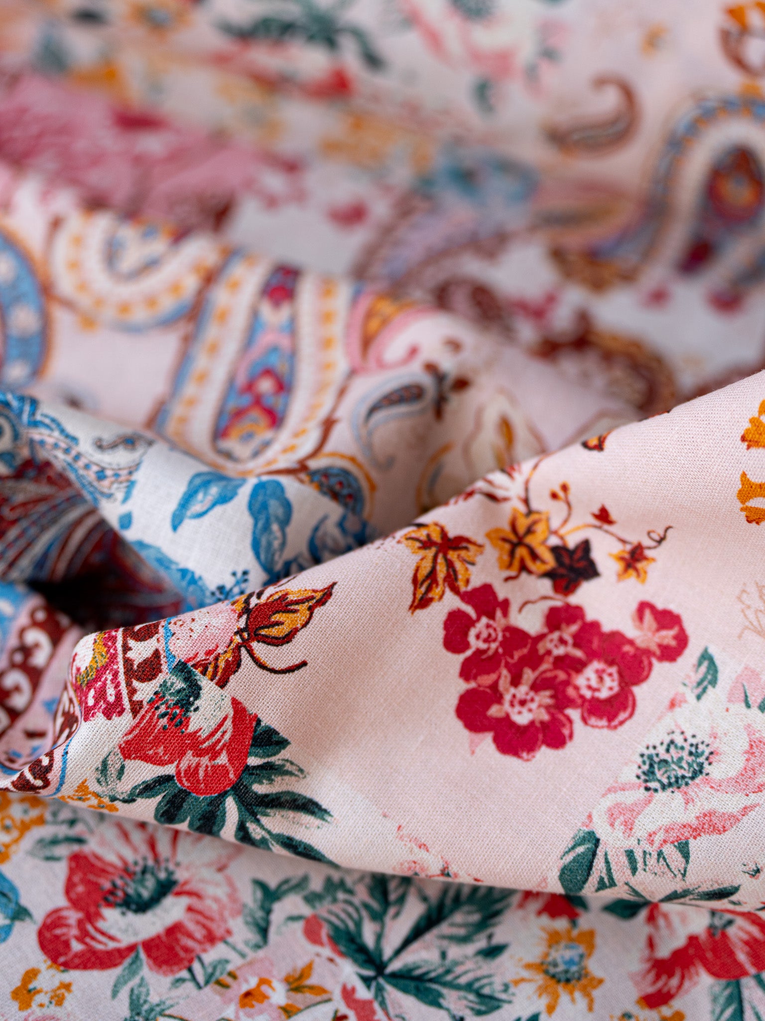 With a charming patchwork-inspired printg, this lightweight linen-cotton blend is perfect for breezy dresses, skirts, pants, and button-ups.