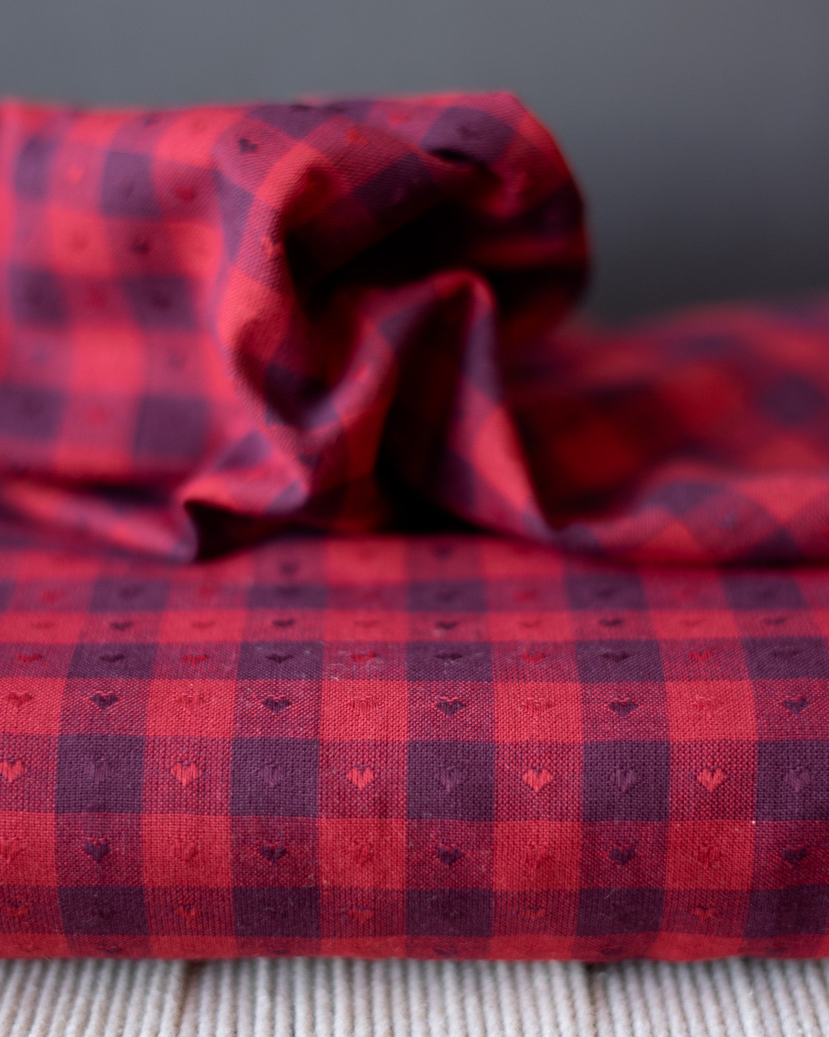 This whimsical dobby heart gingham is part of Fableism's Queen of Hearts collection, perfect for Valentine's Day projects like dresses, quilts, pillows, and purses!