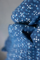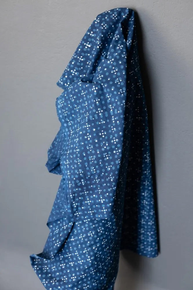 A unique hand block dotted print from Jaipur in shades of mid-blue, indigo, and cream. It's great for tops, loose fitting trousers and shorts, and dresses and skirts.