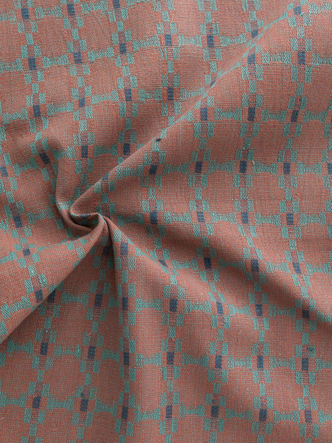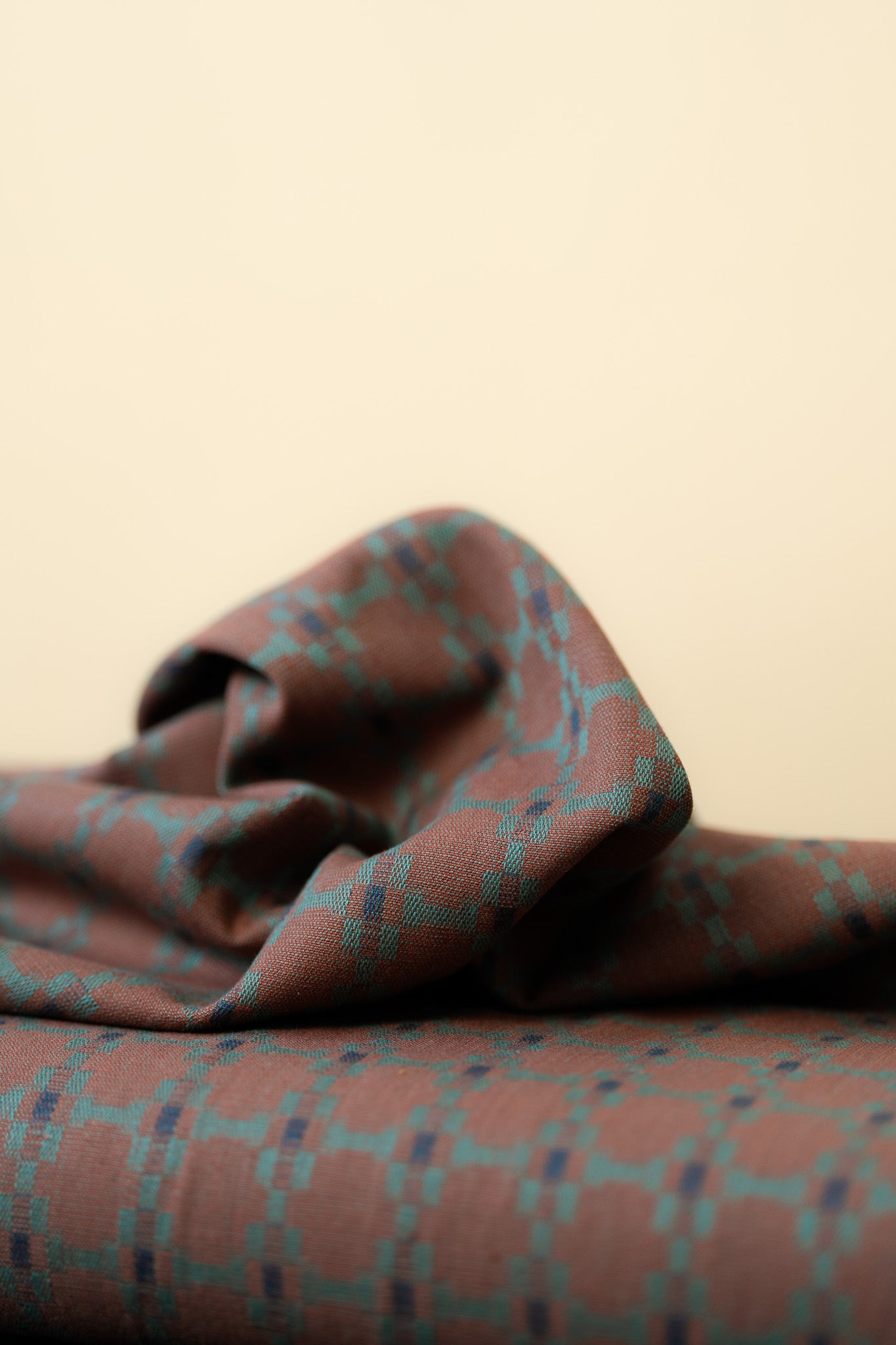 This print woven is part of Fableism's Monarch Grove collection, inspired by colors found in the monarch groves of the California Coast. It's soft and drapey with a fun geometric pattern, making it great for casual apparel, kids clothes, or beach blankets.