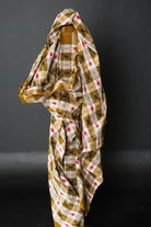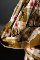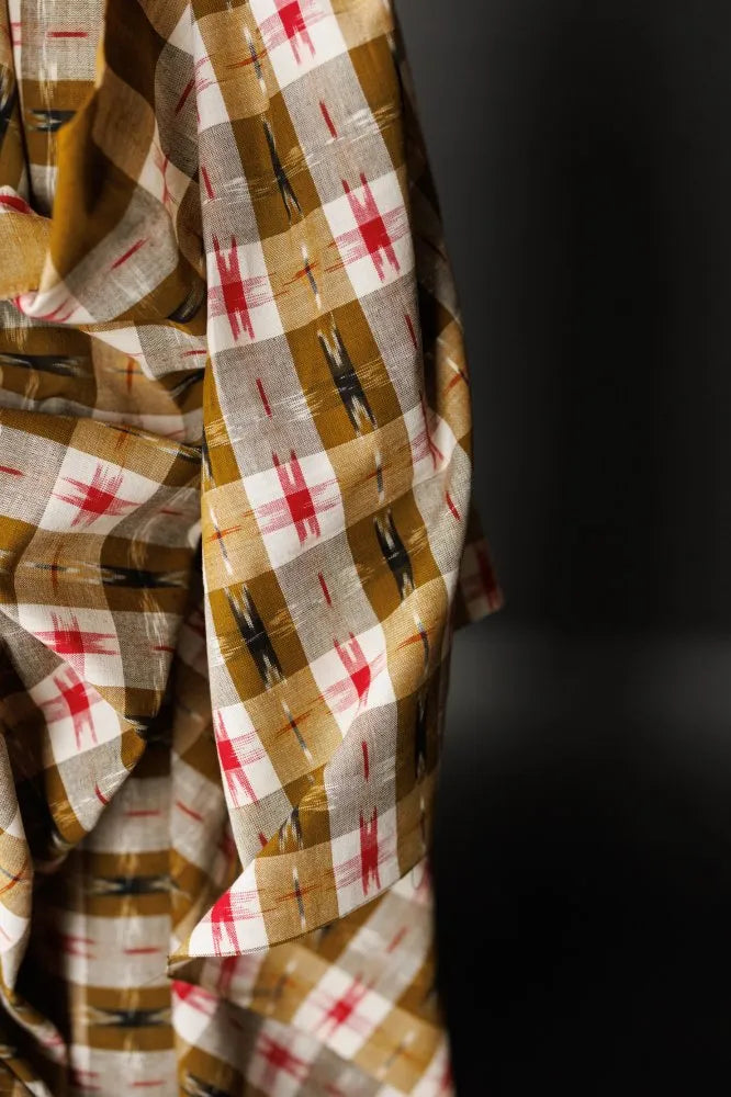 This unique checkered Ikat weave features red and dark brown stars on a background of olive green and off-white. It's perfect for breezy tops, dresses, and loose fitting trousers, and can also be used for quilting and home decor projects.