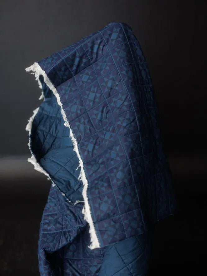 Designed in house using several shades of Indigo, this design is screen printed in India and then quilted with a cotton wadding and a mid blue on the reverse. It's great for quilted jackets, blankets, pillows, and cushions.