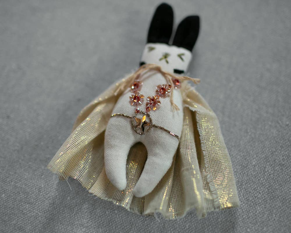 This magical, rock-inspired ornament by Skippy Cotton is handcrafted using a combination of embroidery and beadwork techniques on assorted linens, and stuffed with organic cotton and French lavender—a scent known to relieve feelings of stress.