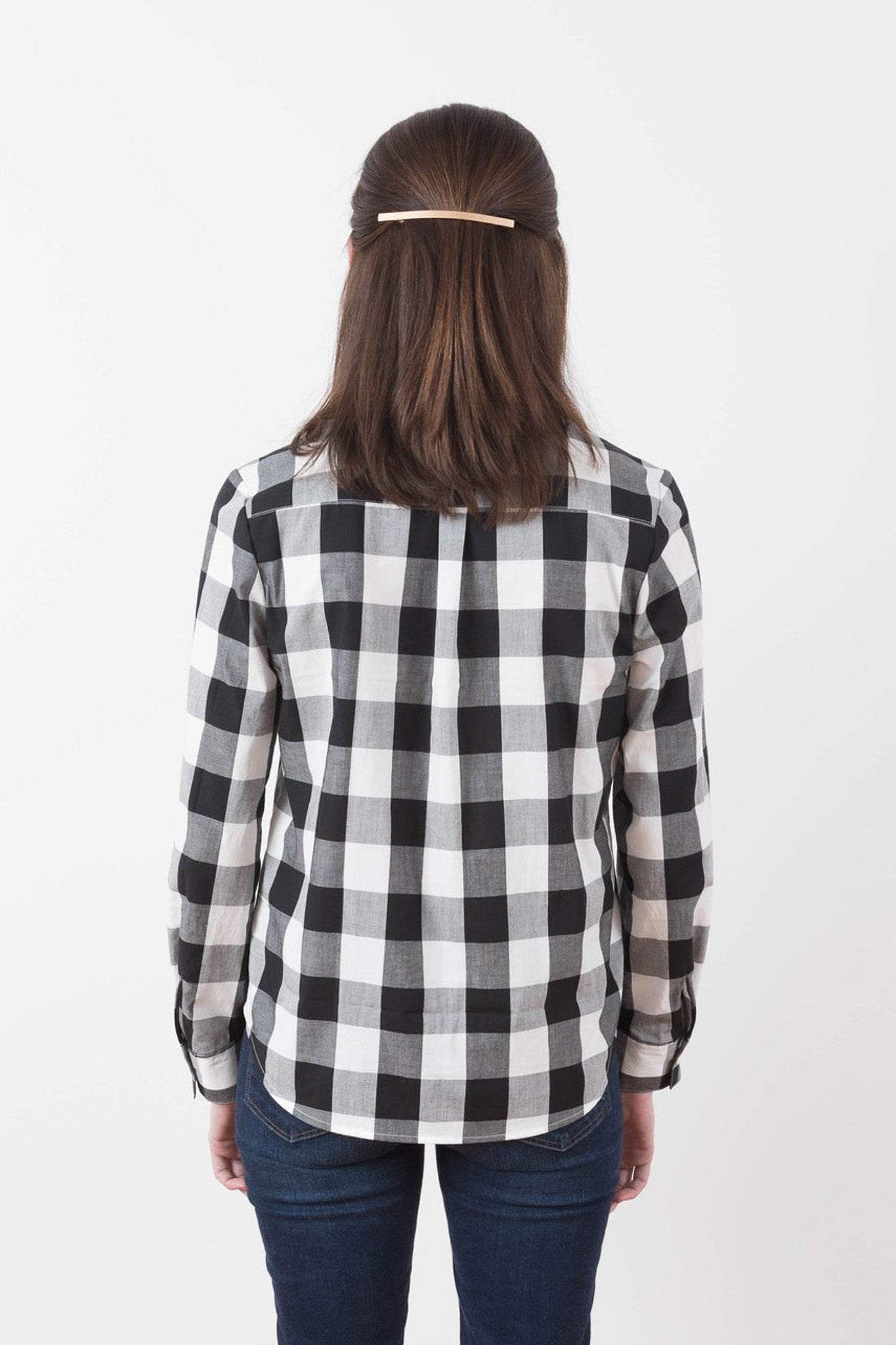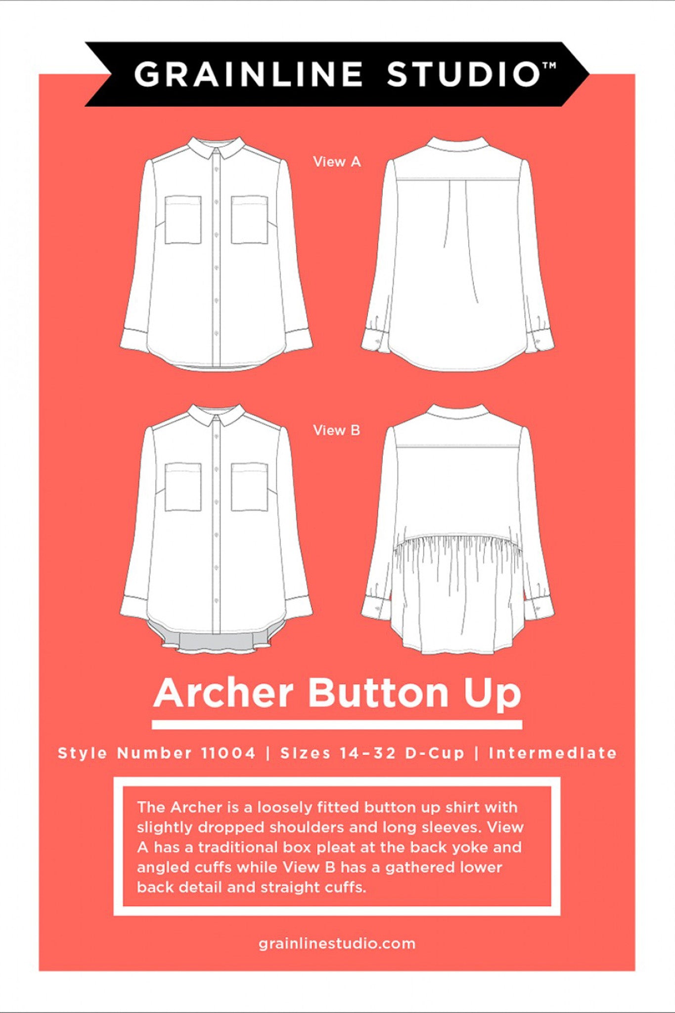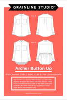 The Archer Button Up is a loosely fitted button up shirt with slightly dropped shoulders and long sleeves. View A has a traditional box pleat at the back yoke and angled cuffs, while View B has a gathered lower back detail and straight cuffs.