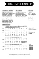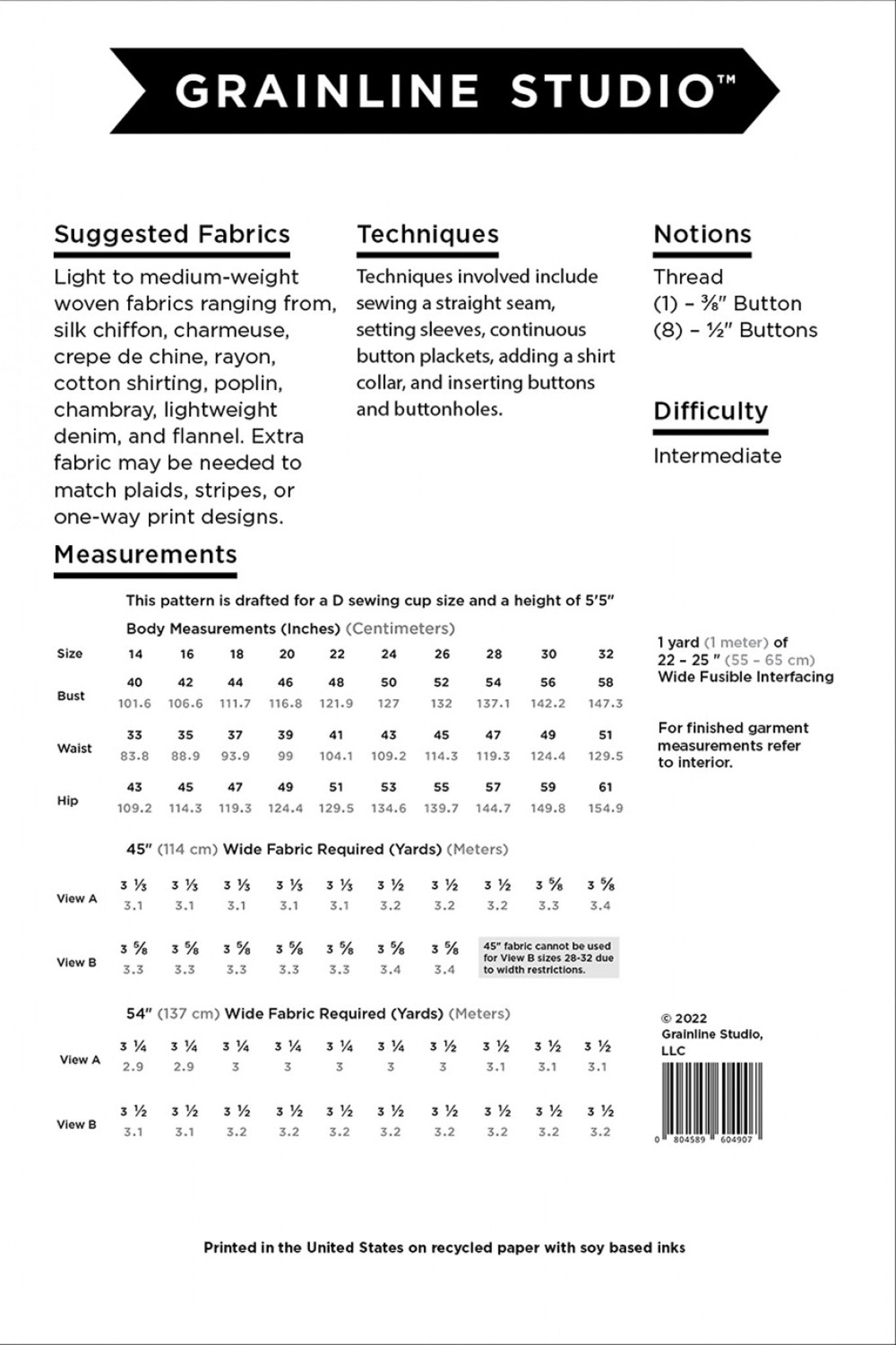 Suggested Fabrics: Light to medium weight woven fabrics ranging from silk charmeuse, crepe de chine, cotton shirting, poplin, chambray, sateen, lightweight to midweight denim, linen, linen blends, and flannel. Extra fabric may be needed to match plaids, stripes, or one-way design prints.