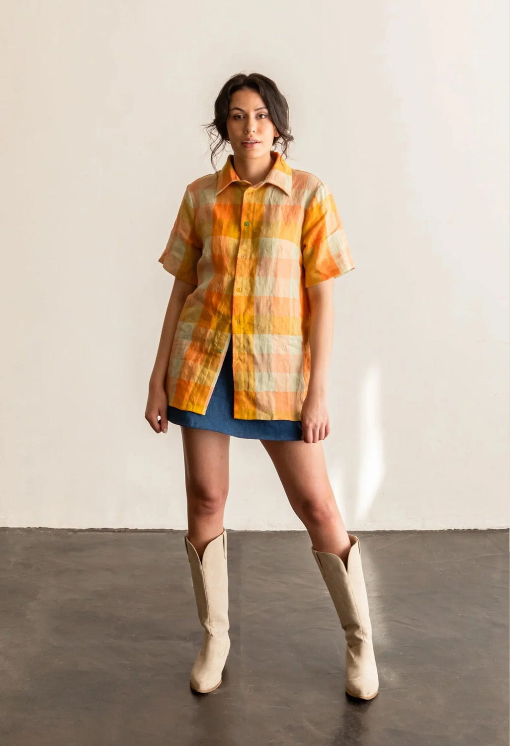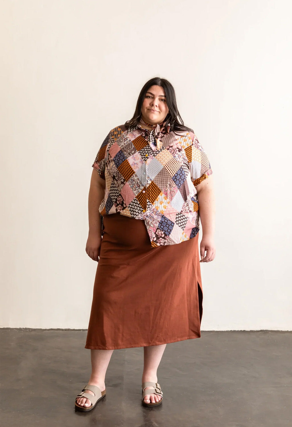 Recommended fabric: The Butano Button Up is designed for woven fabrics. Any sort of light to medium weight woven is suitable. If you choose a fabric like a mid-weight twill or denim, you will get a more structured top. If you choose a drapier fabric like a rayon challis or silk, you will get a blousier top.