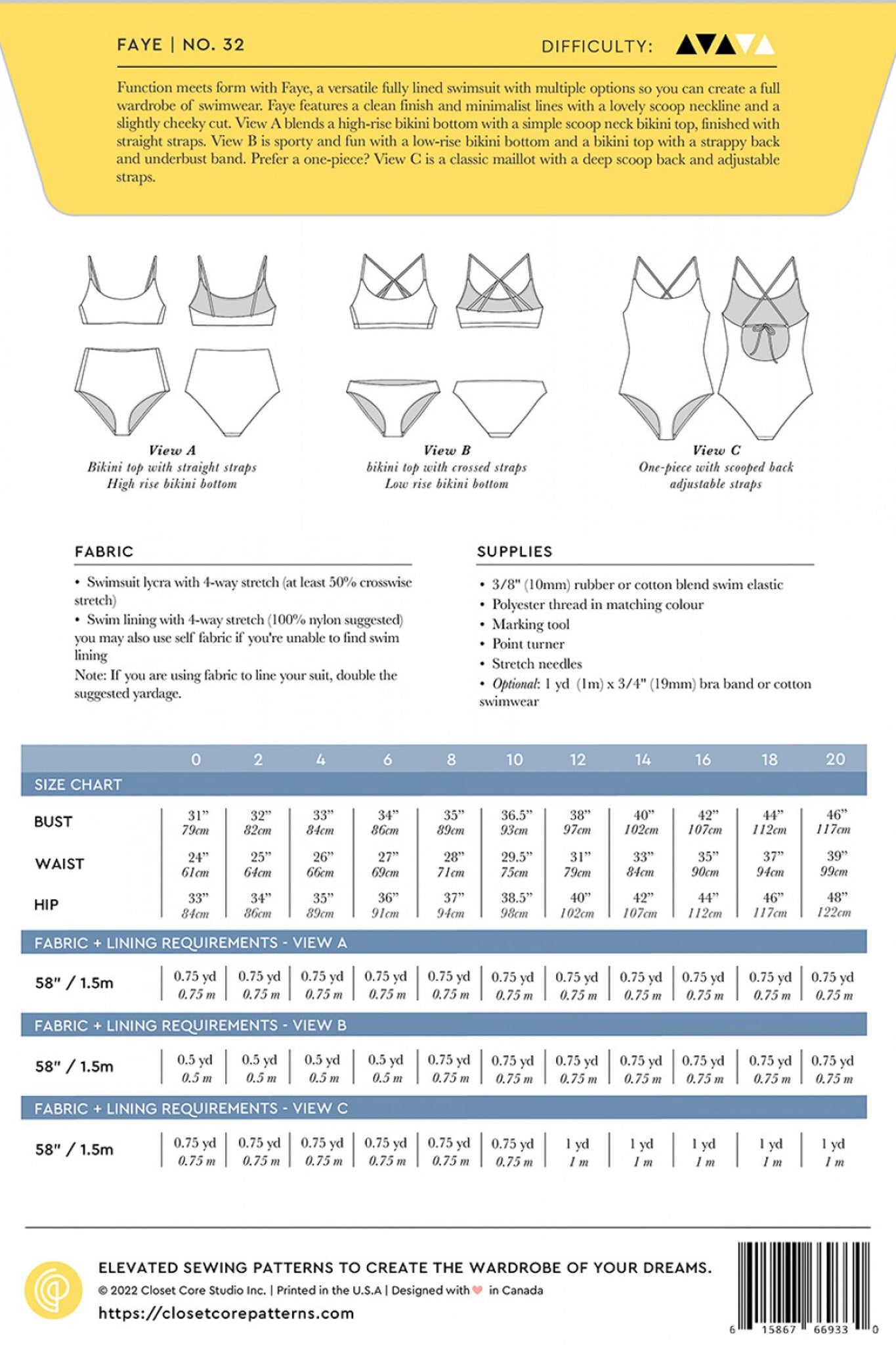 Function meets form with Faye, a modern, versatile, and fully lined swimsuit. With a clean finish and minimalist design lines, the Faye Swimsuit features a scoop neckline and a slightly cheeky cut, with enough variations to create a full wardrobe of swimwear. View A blends a high-rise bikini bottom and a bikini top with straight straps. View B is sporty and fun with a low-rise bikini bottom and a bikini top with a strappy back and supportive underbust band. Prefer a one-piece? View C is a classic maillot with a deep scoop back and adjustable straps.