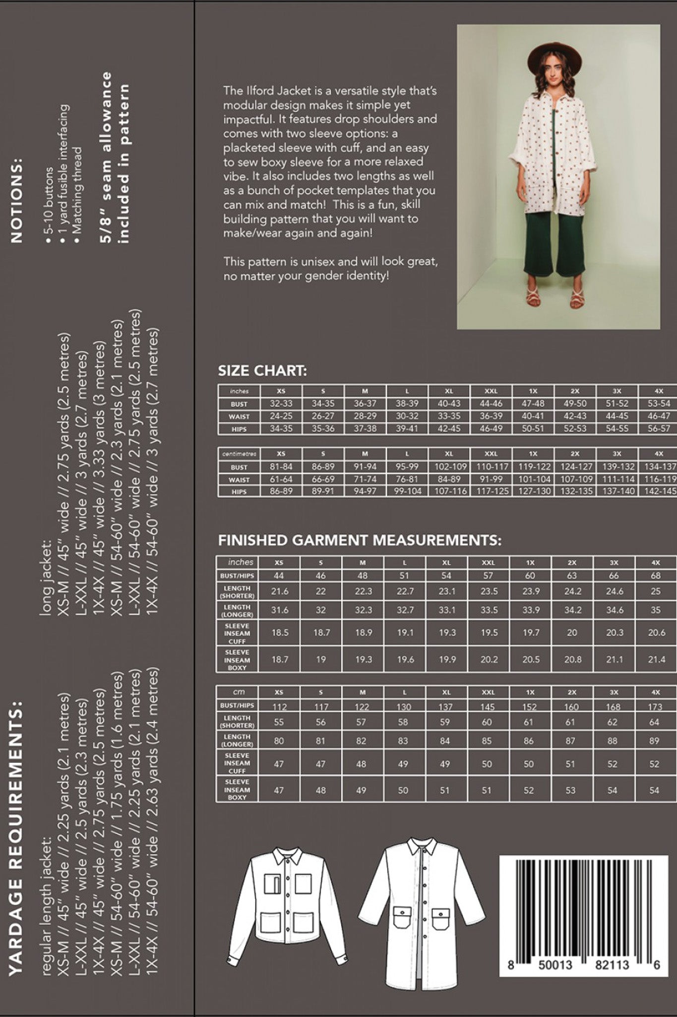 The Ilford Jacket is a versatile style that’s modular design makes for a pattern that is simple, yet impactful. It can be customized a million different ways and really is an easily customized type of pattern that incorporates your design sense into the project! It features drop shoulders and comes with two sleeve options: a placketed sleeve with cuff, and an easy to sew boxy sleeve for a more relaxed vibe. It also includes two lengths as well as a bunch of pocket templates that you can mix and match! The possibilities are endless! You can wear the Ilford as a jacket or shirt depending on the fabric you use. This is a fun, skill building pattern that you will want to make/wear again and again.