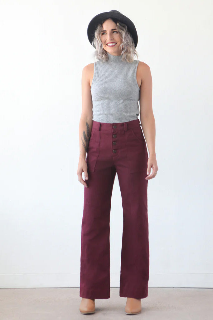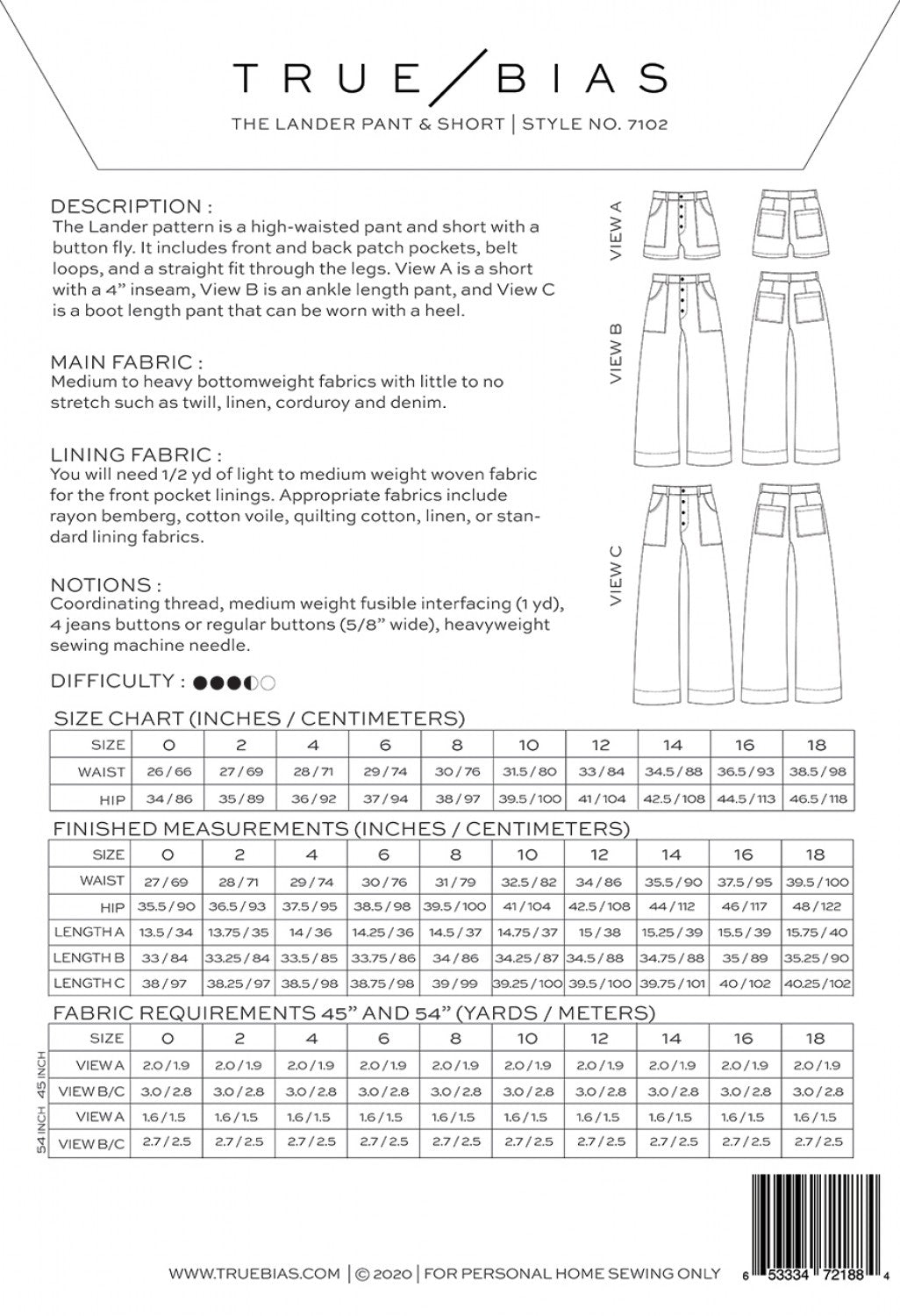 With a high waist and button fly, the Lander pattern is not only on trend, but also flattering and comfortable for all body types. The pattern includes front and back patch pockets, belt loops, and a straight fit through the legs. View A is a short with a 4” inseam, View B is an ankle length pant, and View C is a boot length pant that can be worn with a heel.