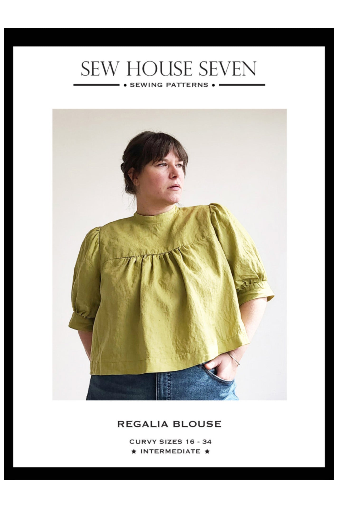 The Regalia Blouse is a favorite here at Sew House Seven. With all of its gathers, puffy sleeves and high collar, the Regalia still manages to look effortless and casual. The roomy fit of the bodice makes it so comfortable to wear. It pulls on over the head and ties at the back keyhole opening. It also features front and back yokes and a stand-up collar. There are two lengths and two sleeve designs to mix and match. Choose between a loose and flowy cropped hem to wear with high waist pants and skirts or a slightly longer tuck-in length blouse with an optional waist tie. The long sleeves (A) are gathered at the shoulder and narrow at the wrist while the short sleeves (B) are gathered at the shoulder and gathered into a cuff that lands just above the elbow. You can add an optional tulle sleeve head pouf to add a bit of volume to your sleeves.