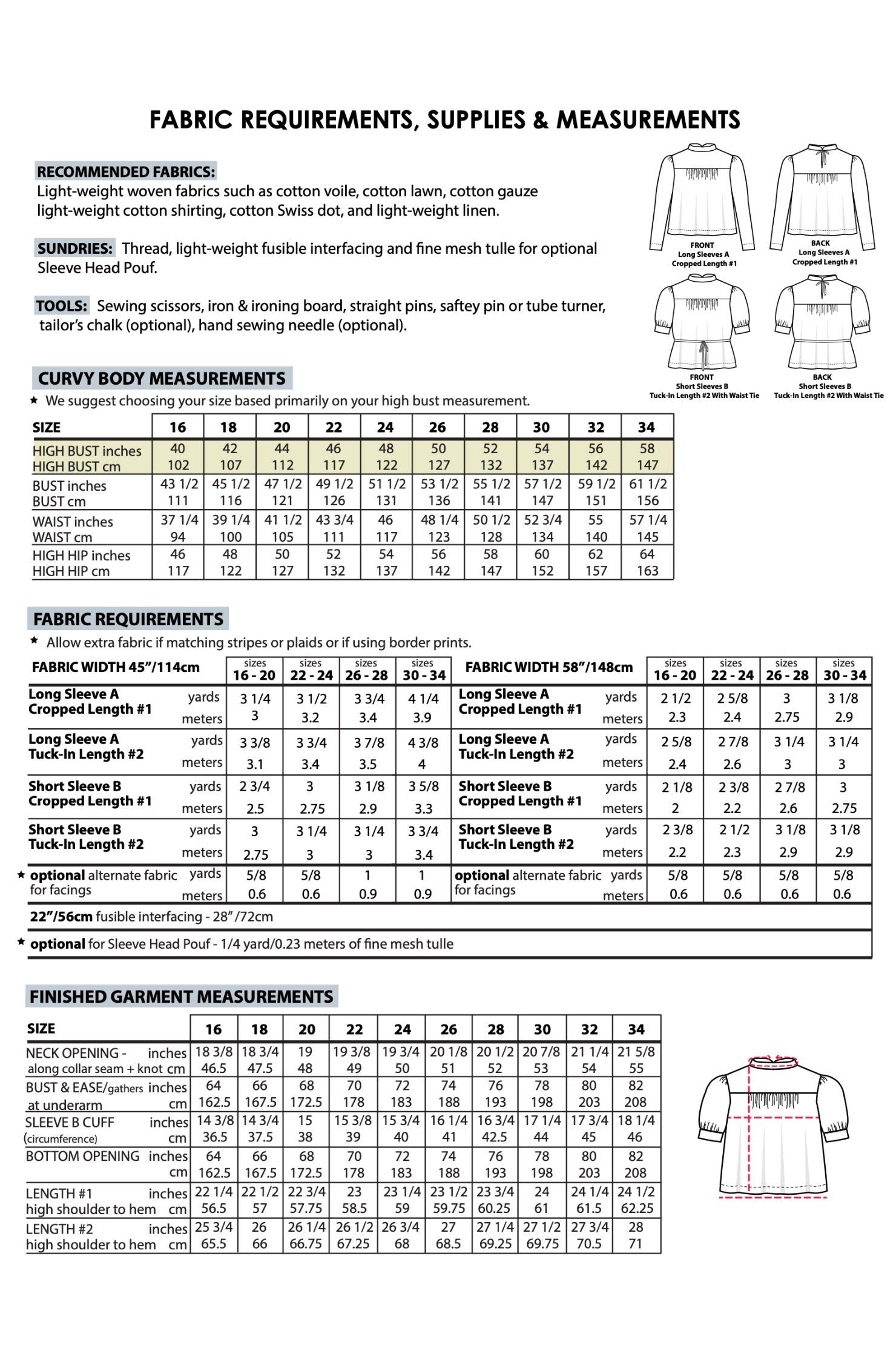 Suggested Fabrics: The Regalia looks best when sewn in a light-weight, woven fabric such as cotton voile or lawn but it also looks lovely in linen. Just be aware that looser weave fabrics such as linen and gauze will result in a slightly looser fitting garment.