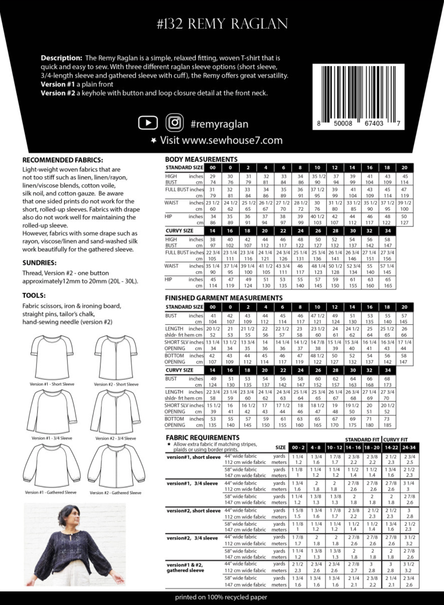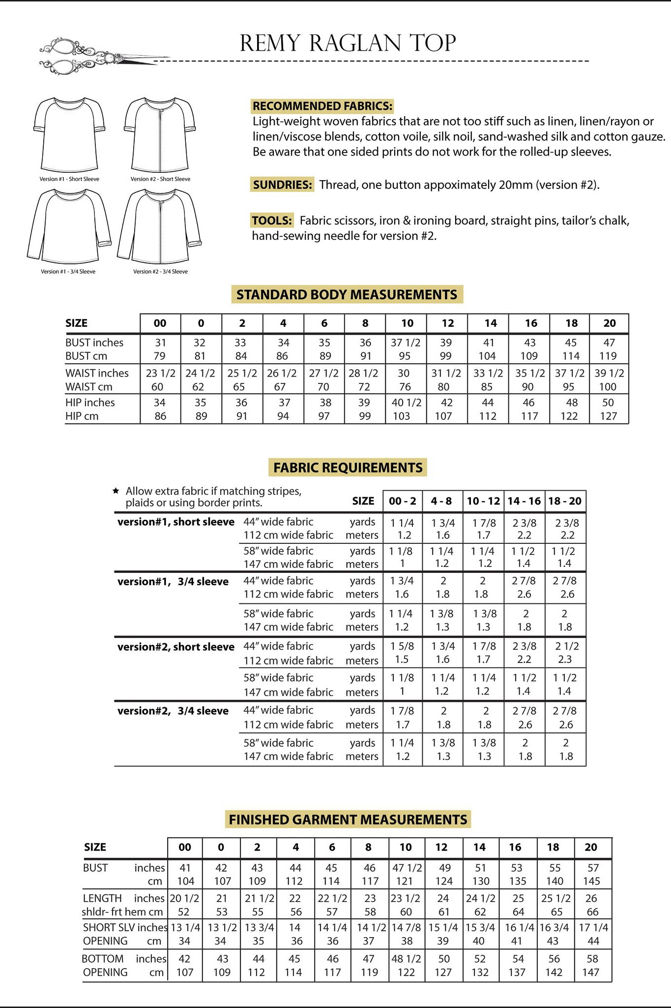 The Remy Raglan top is a simple, timeless top that's quick to make. It features a relaxed fit at the bust and waist with three sleeve choices and an optional keyhole button closure. The Remy Raglan has two front options and three sleeve options, all of which are compatible with both fronts. Version #1 is a plain front; Version #2 features a split center and keyhole button closure.
