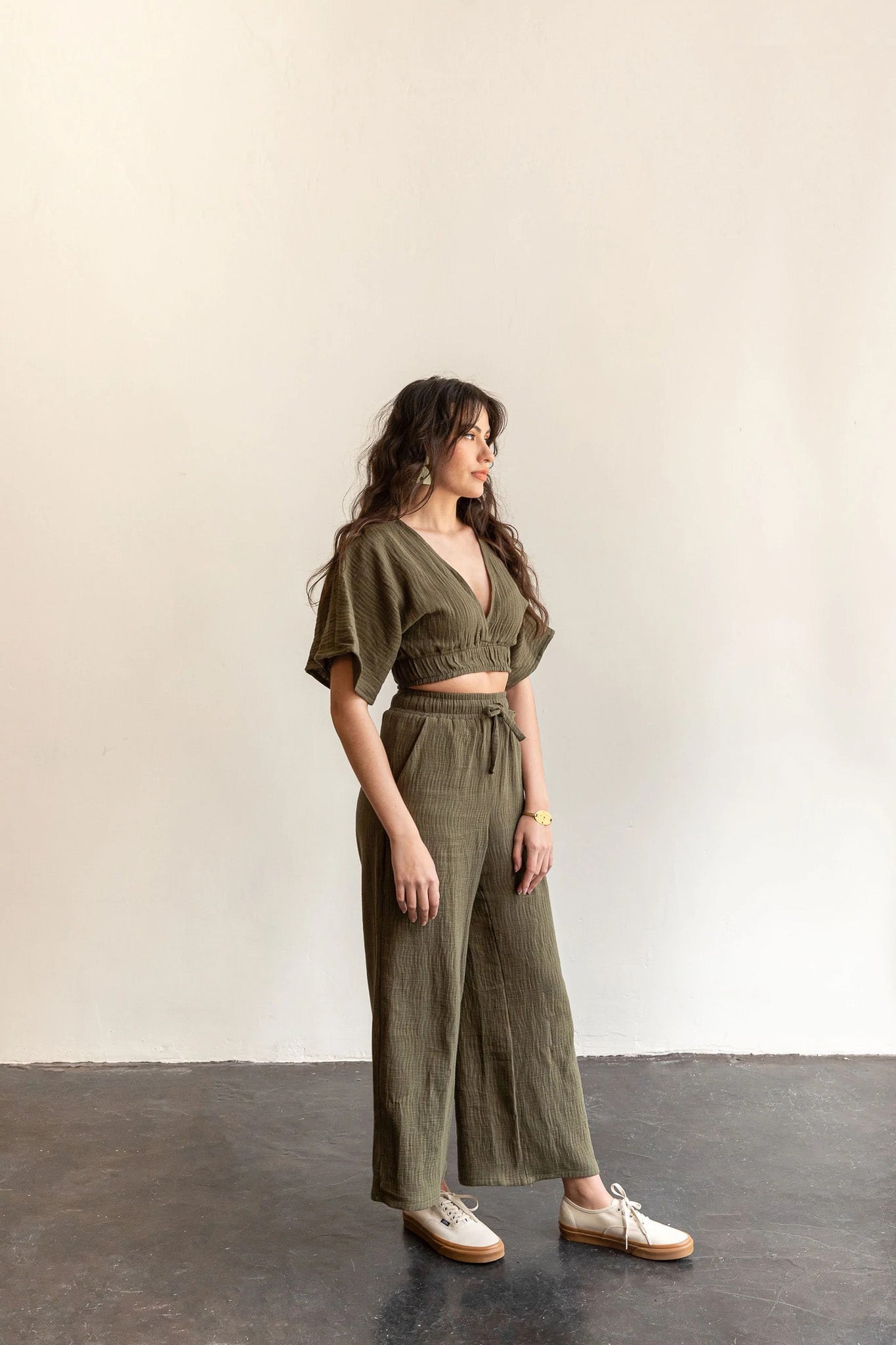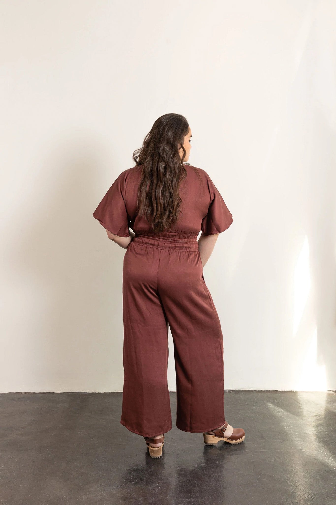 The Saguaro Set is a two piece woven set made up of elastic waistband pants and a pullover top. This is the perfect outfit for road trips through the desert, sunset walks on the beach, or dancing the night away. The pants feature roomy pockets and a waistband with a drawstring. The top has a plunging V neckline that includes an optional tie closure. You can wear the top backwards or forwards. This flowy set is easy to sew and fun to wear with endless options for customization.