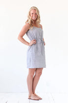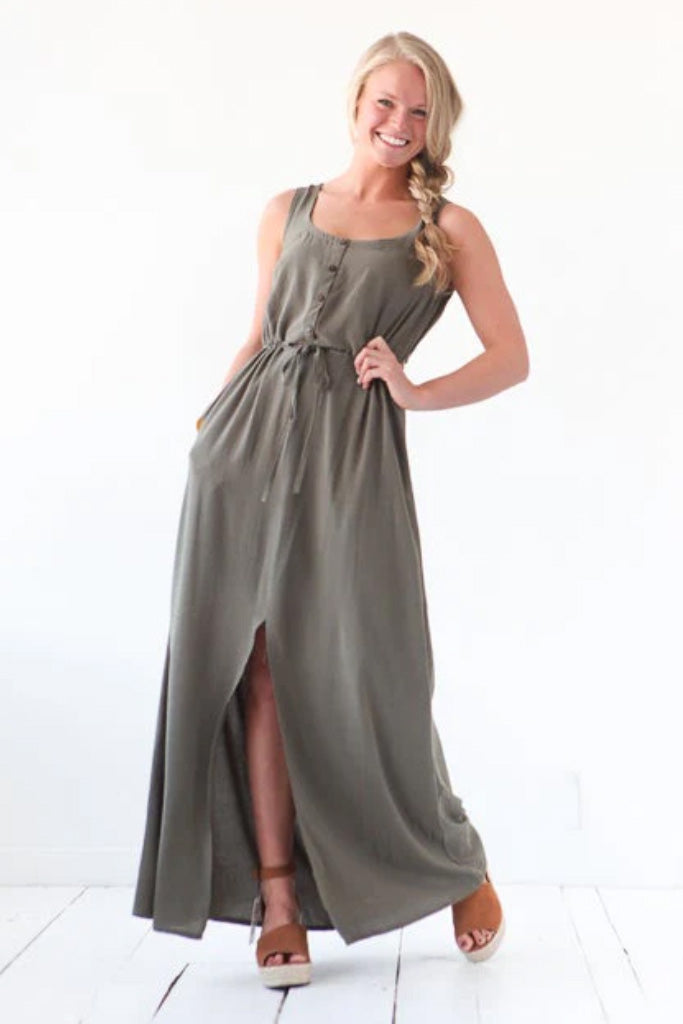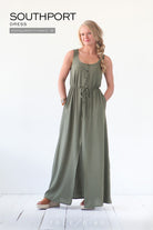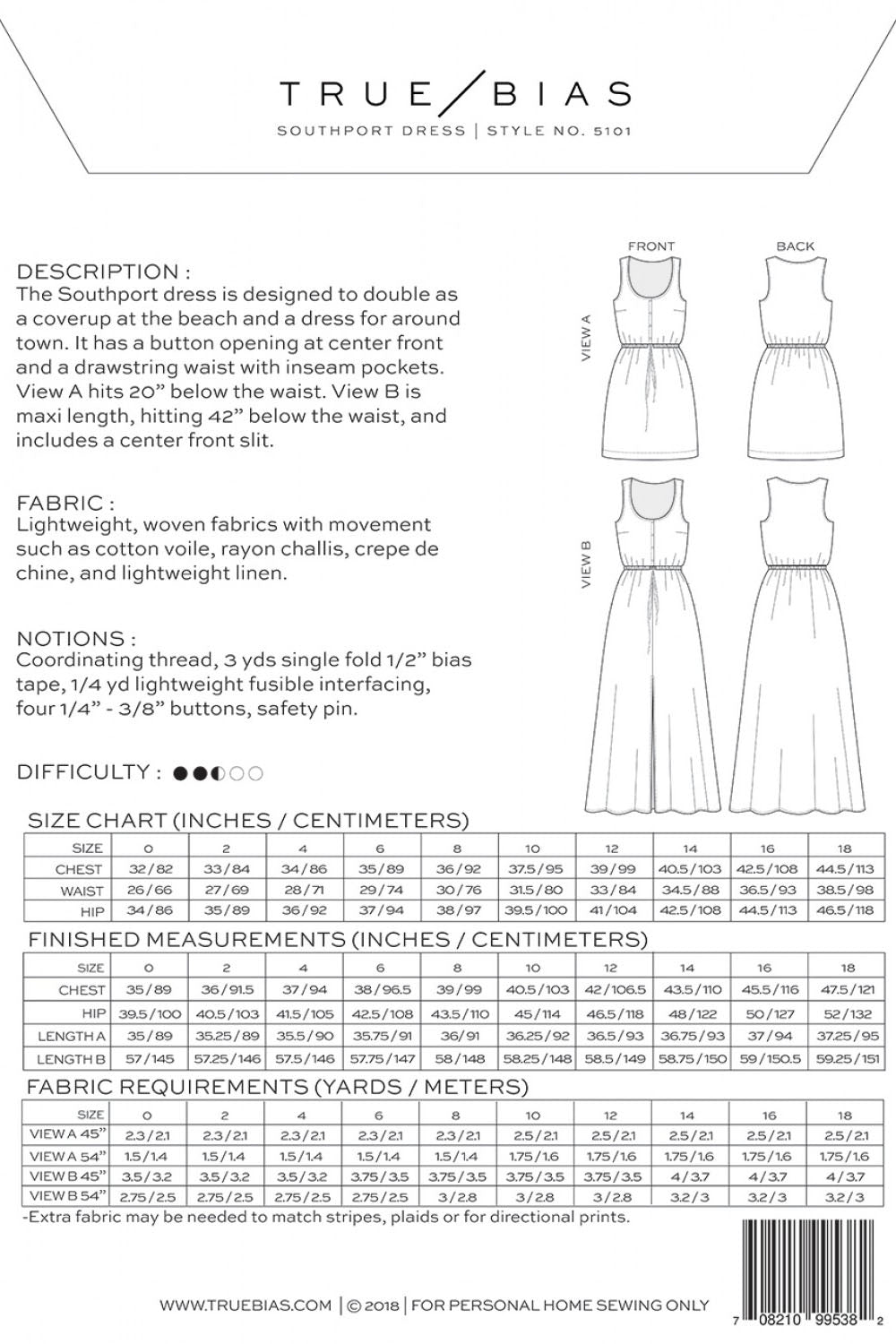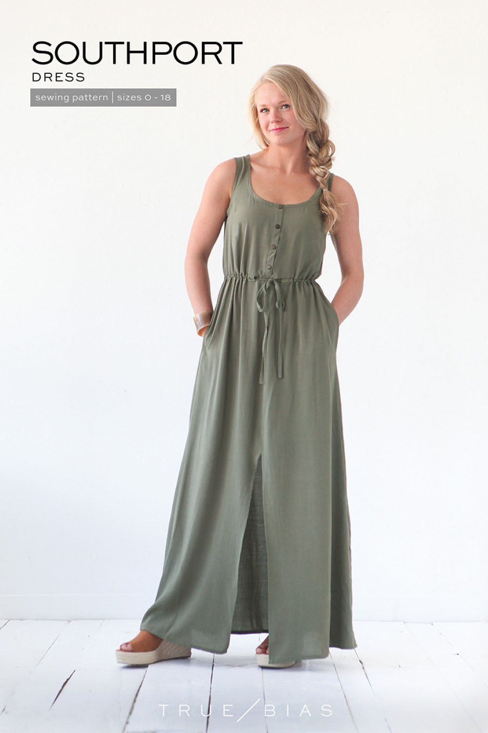 The Southport dress is a tank style dress designed to be worn as a coverup at the beach or a dress for around town. It has a button opening at center front and a drawstring waist with inseam pockets. View A hits 20” from the waist. View B is maxi length and hits 42” from the waist and includes a center front slit.