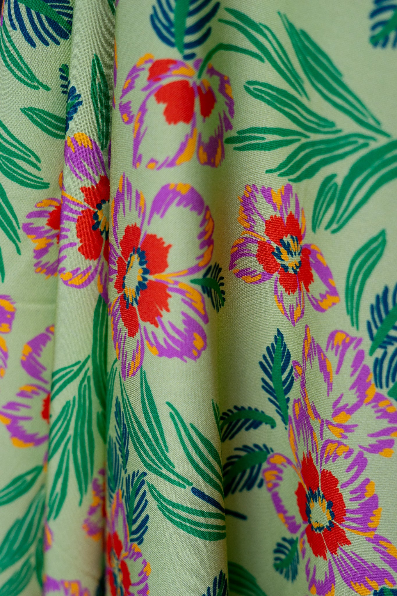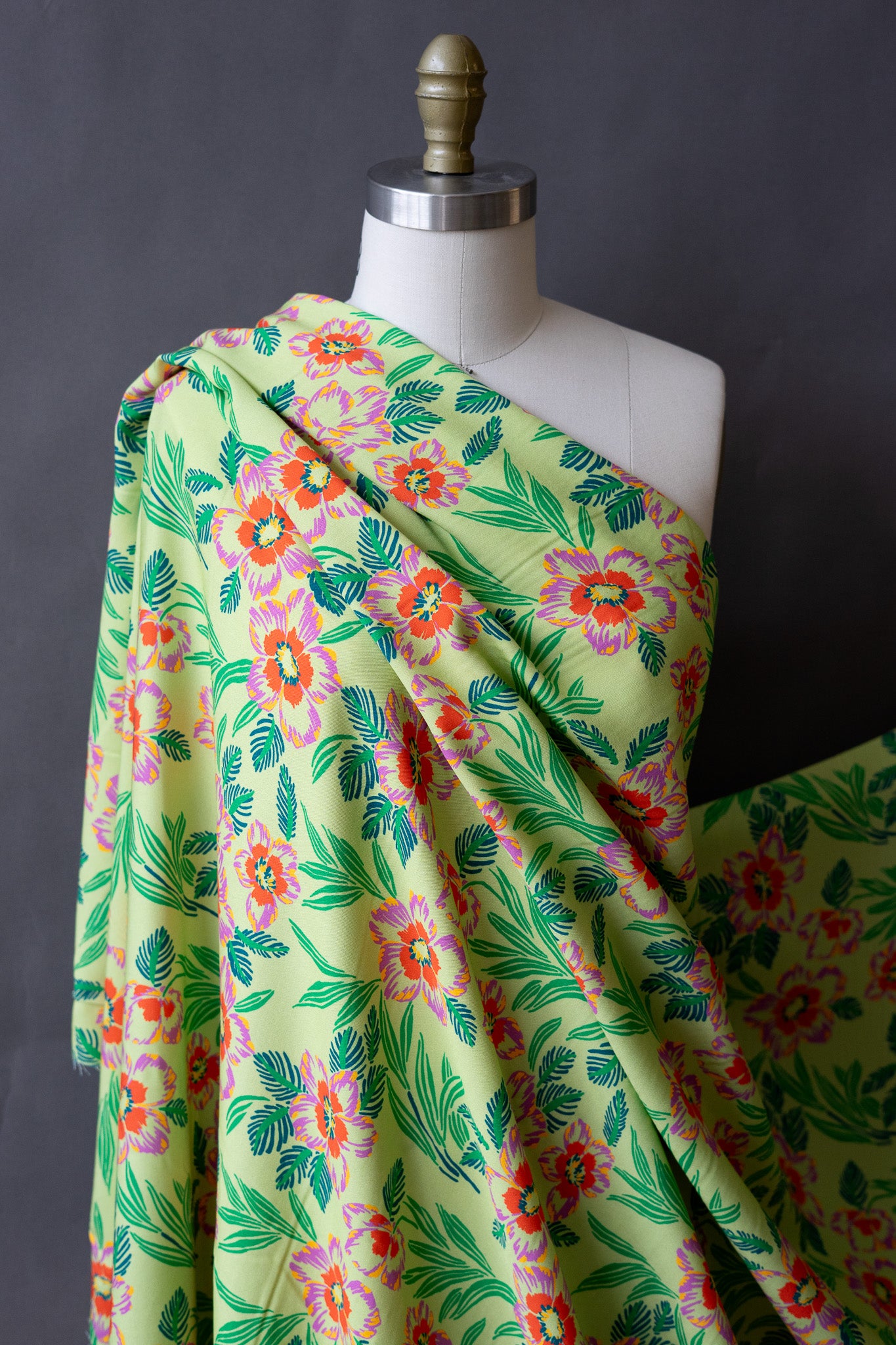 This vintage-inspired viscose twill has a features a cheerful floral print on a lime green background. It's perfect for a dramatic dress or button-up blouse.