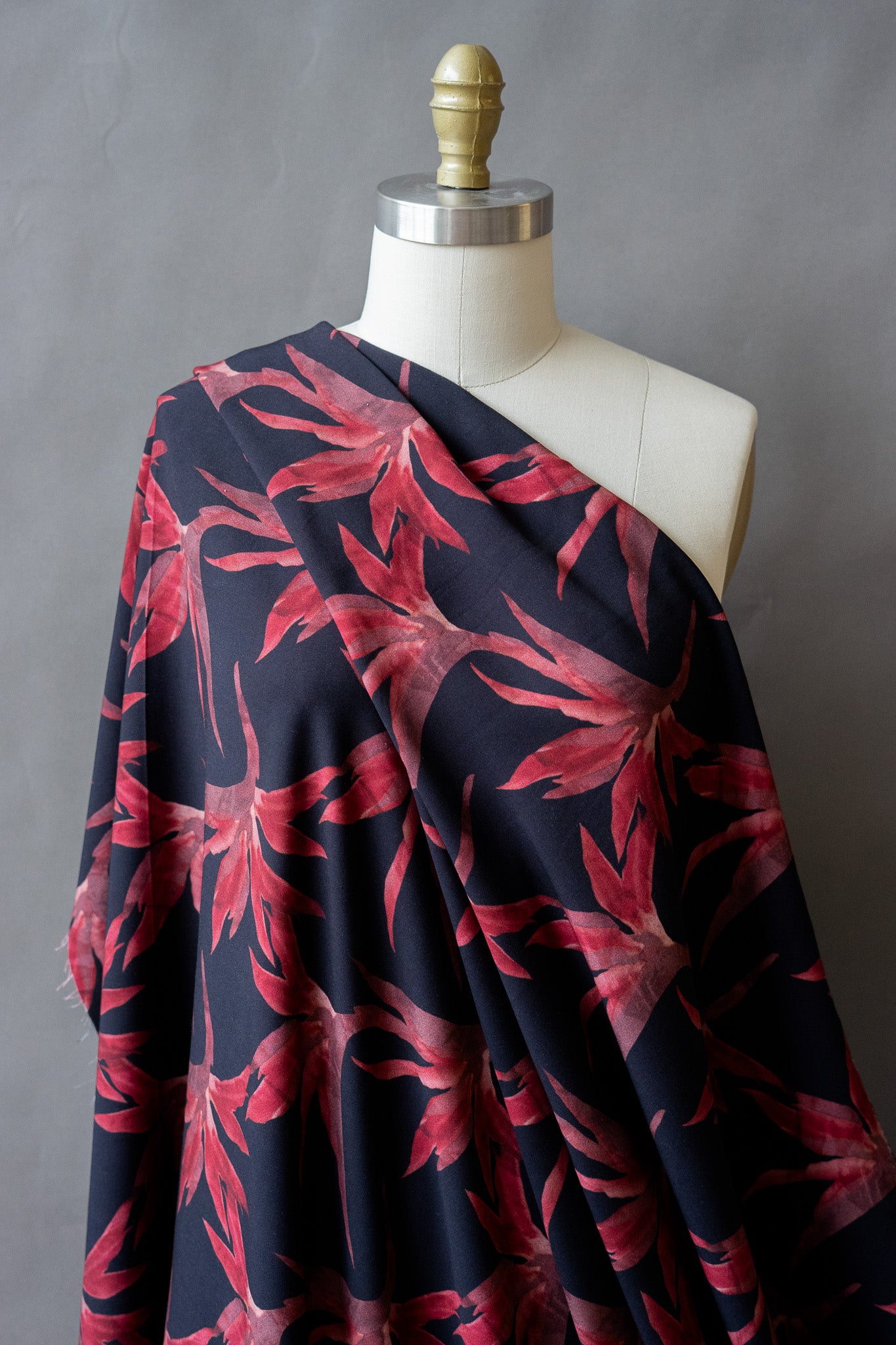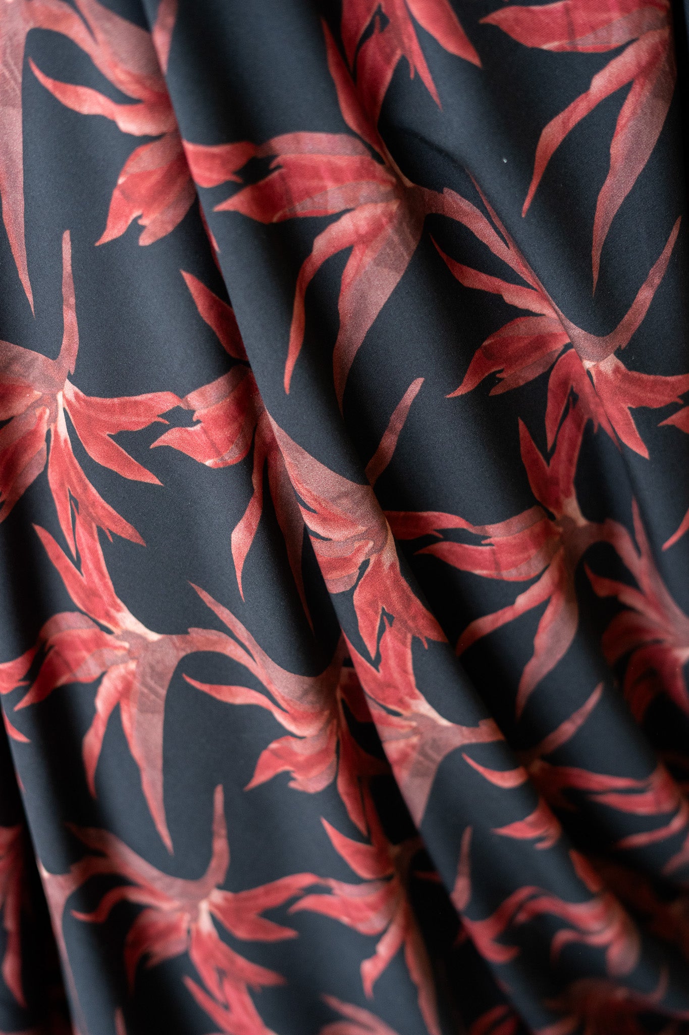 This viscose twill has a features a maroon tropical print on a charcoal background. It's perfect for a dramatic dress or button-up blouse.