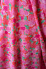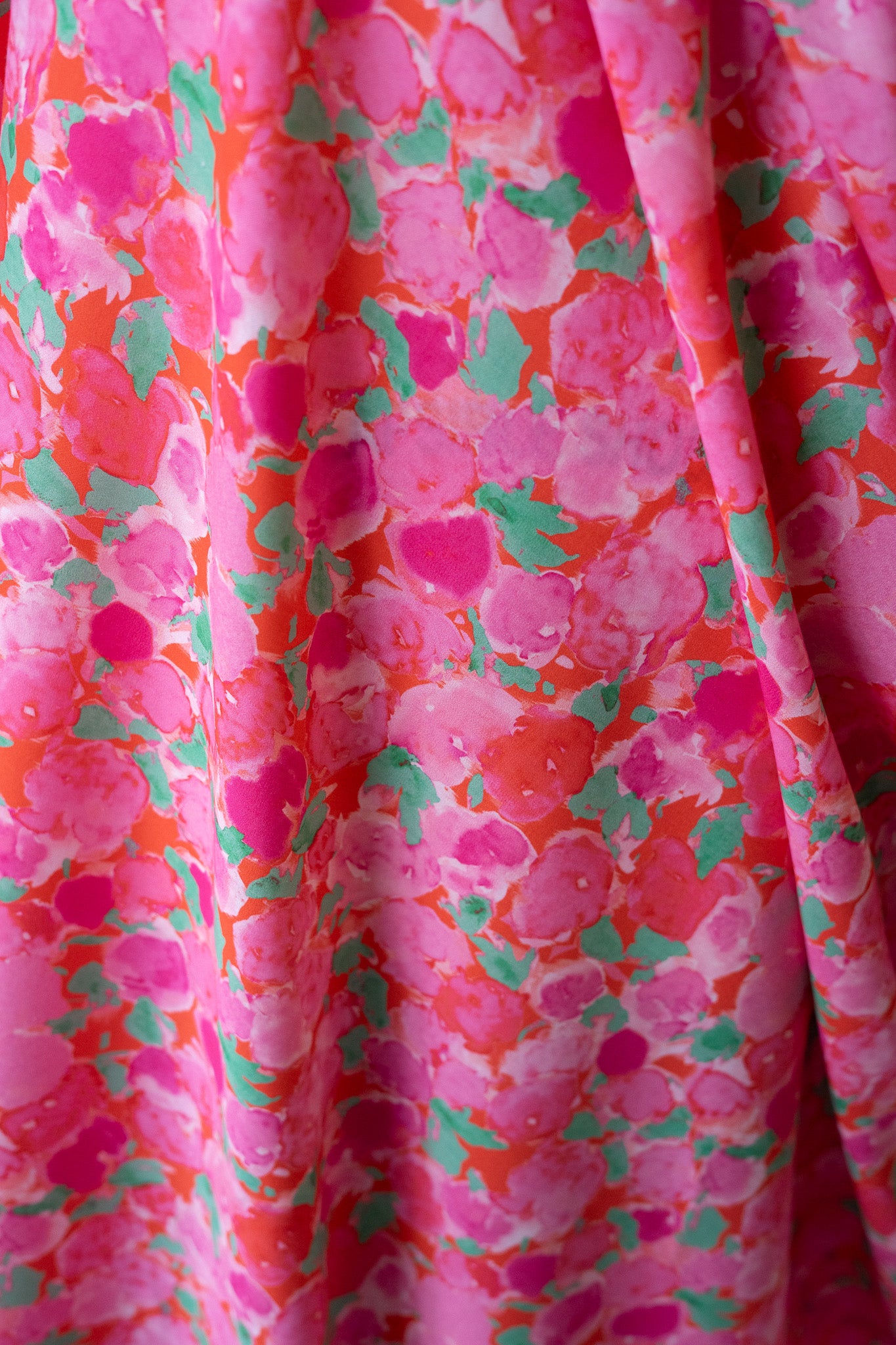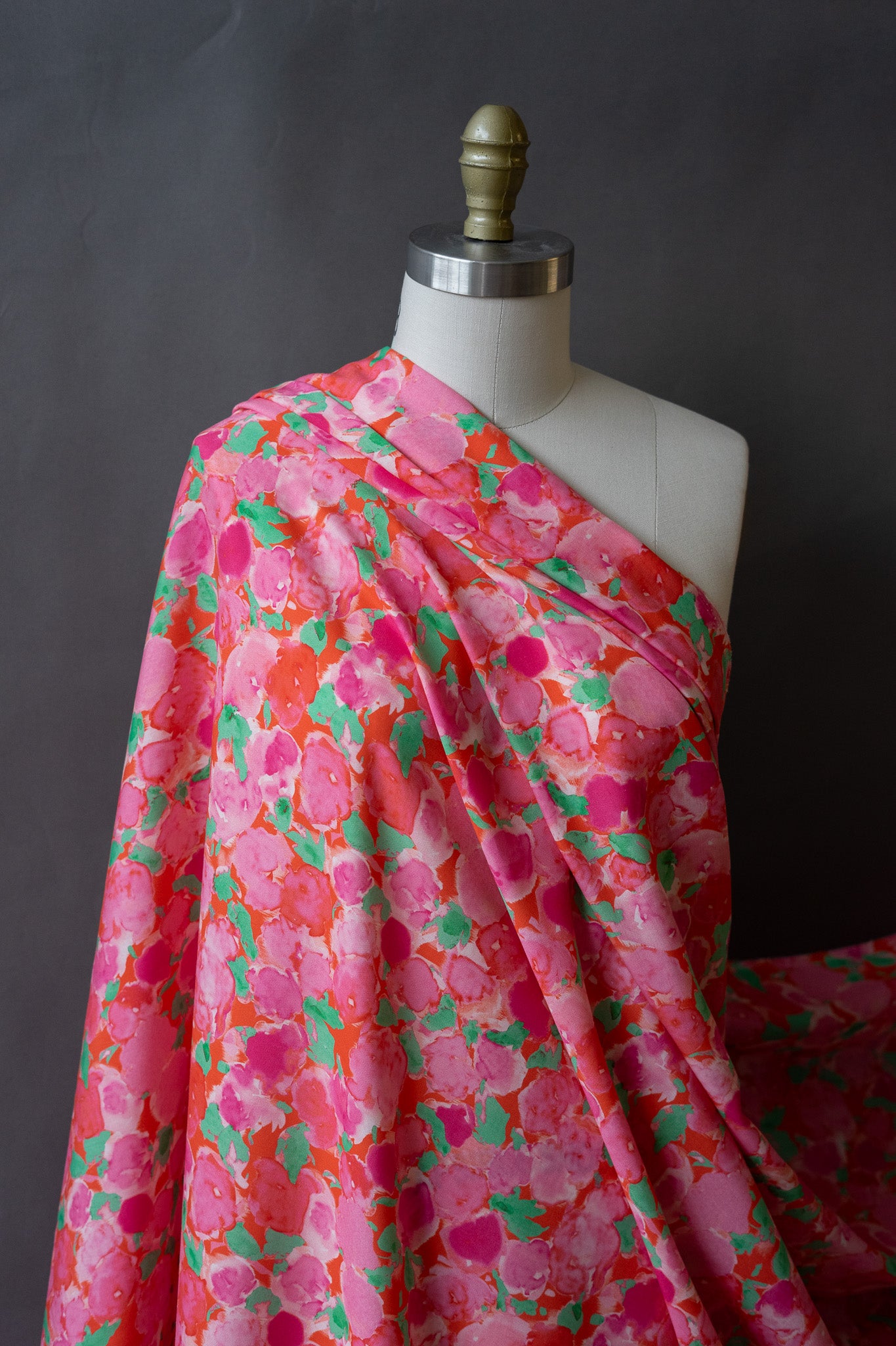 This viscose twill has a features an orange and pink floral print with green accents. It's perfect for a dramatic dress or button-up blouse.