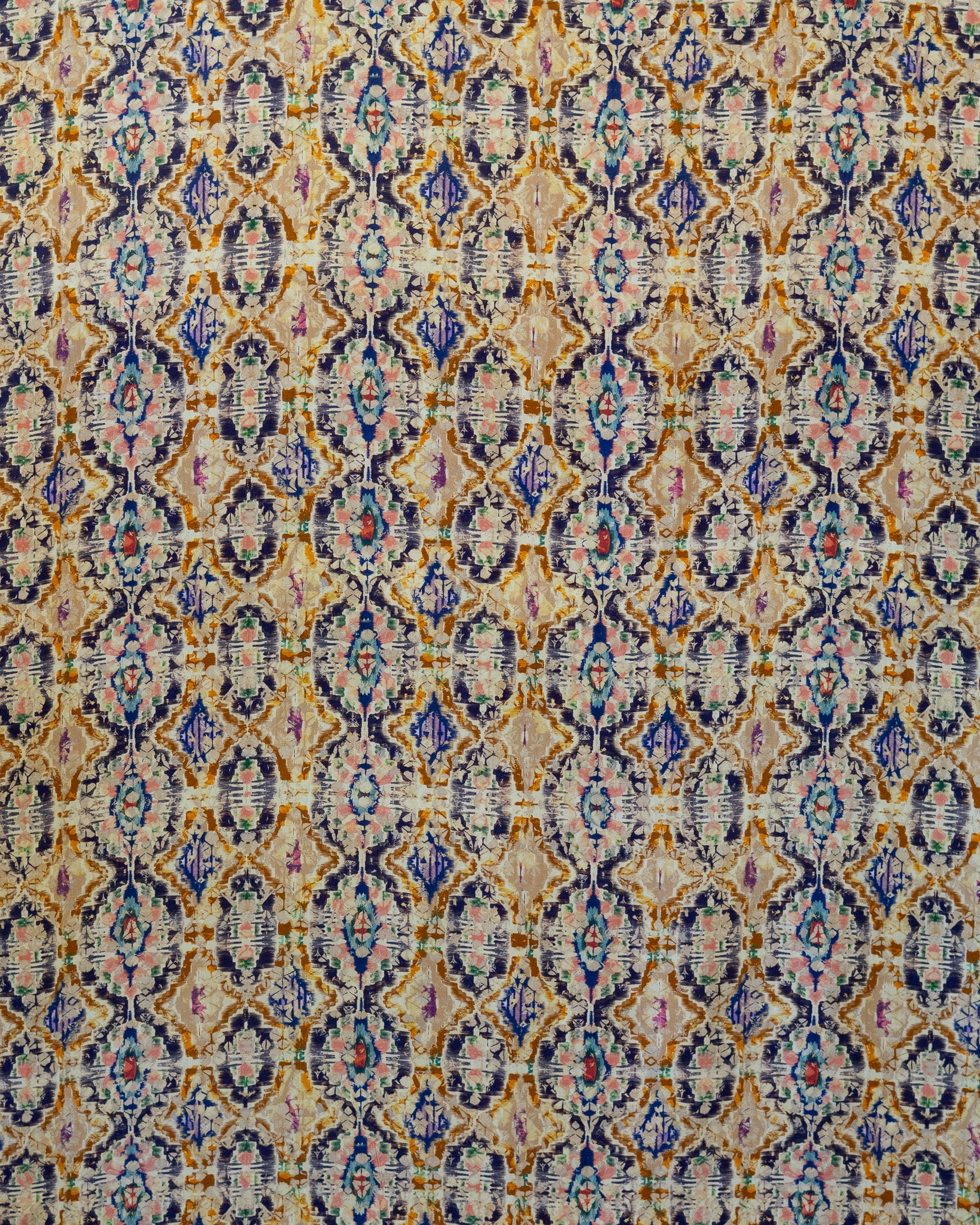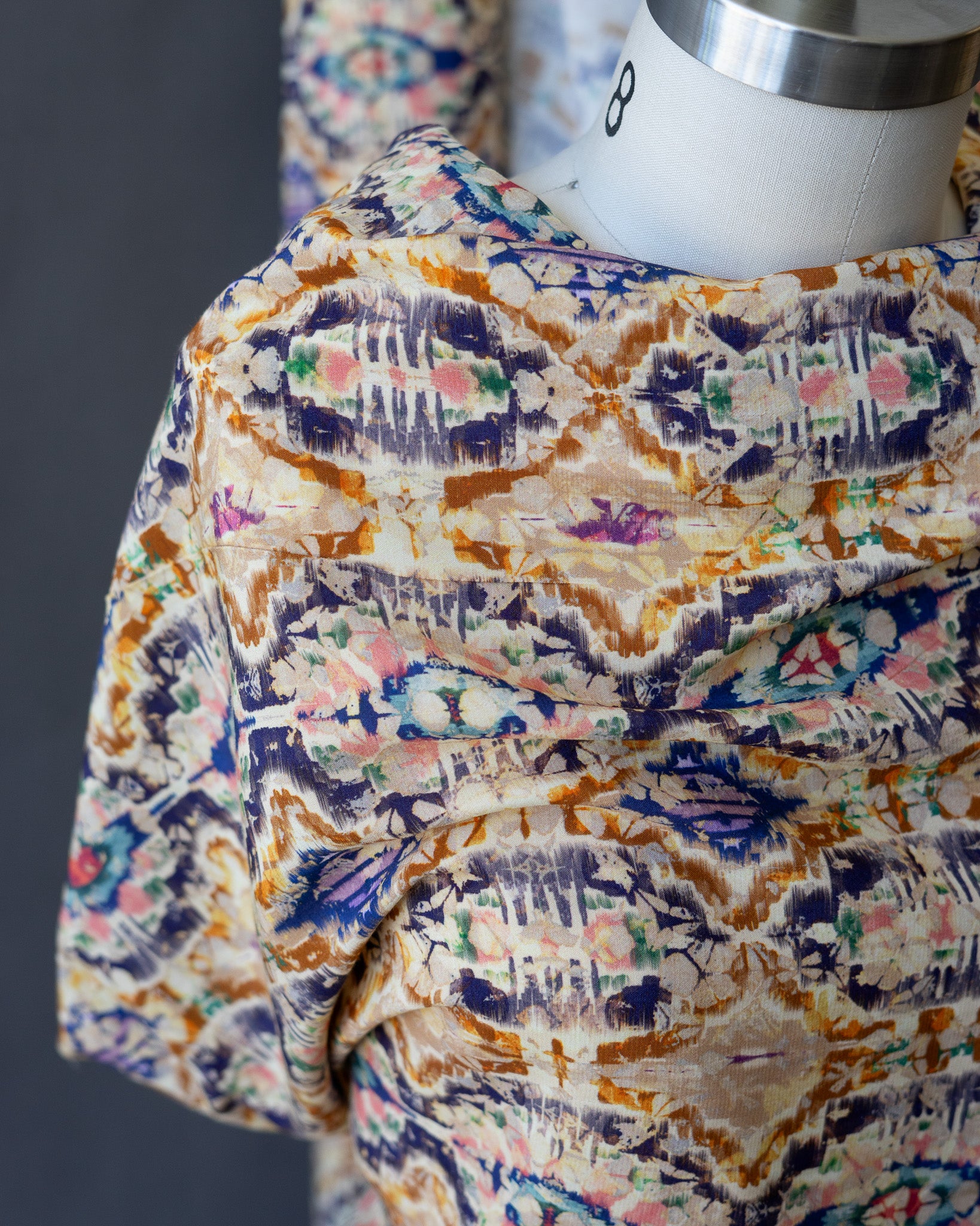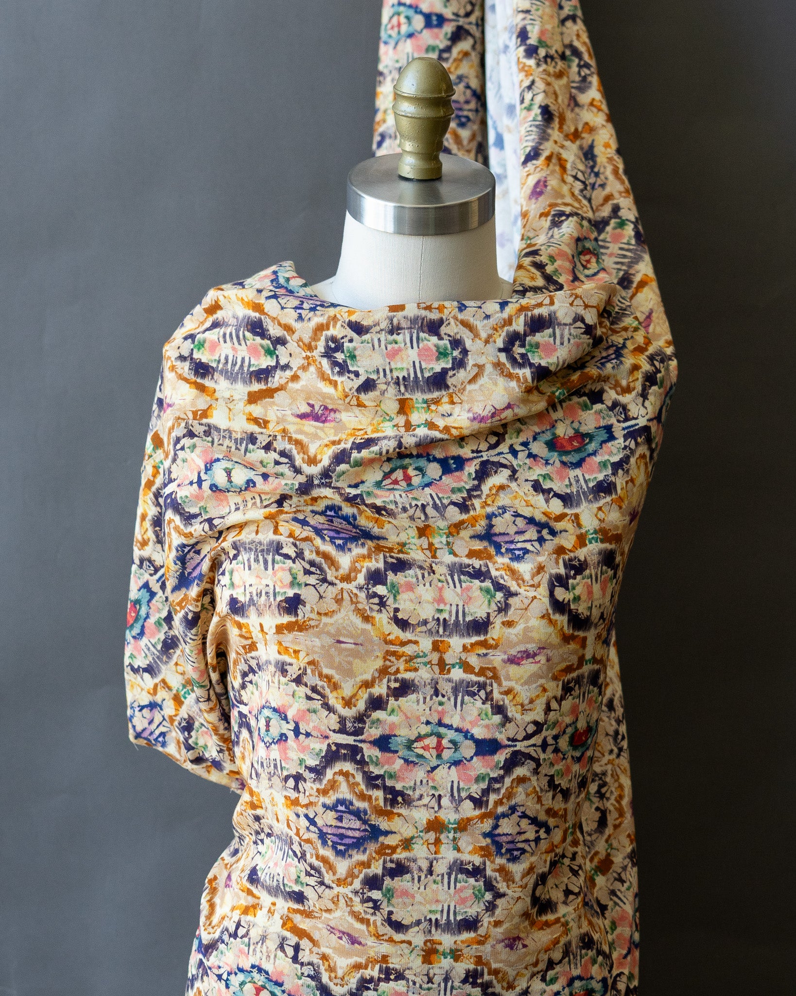 This designer viscose challis has a psychedelic print with a resist-dye effect. It's perfect for a dramatic dress or button-up blouse.
