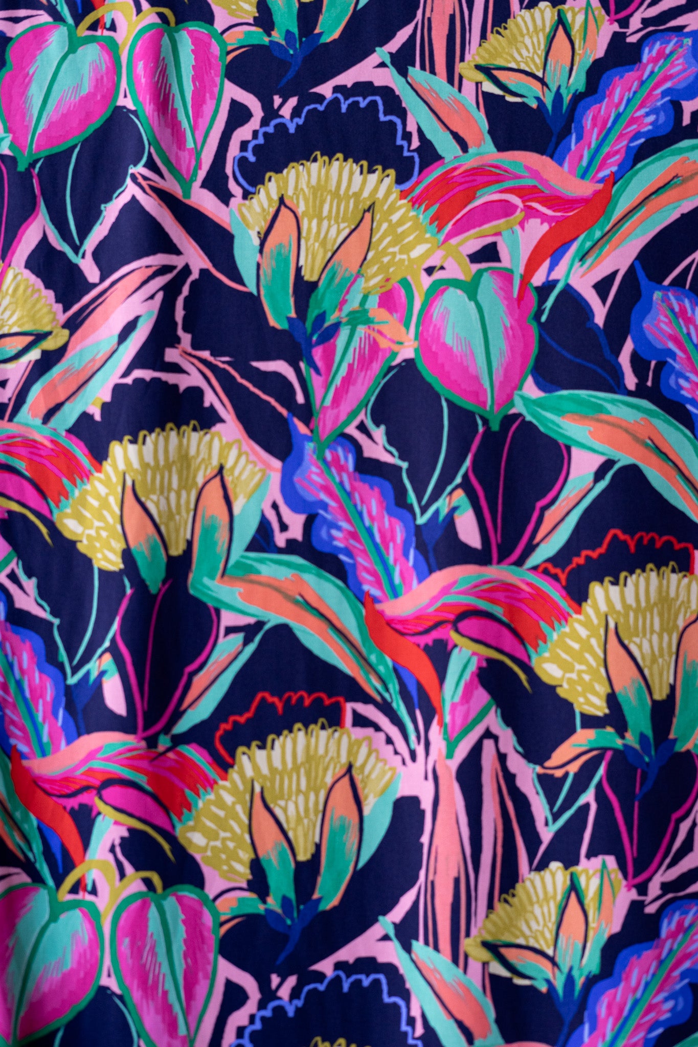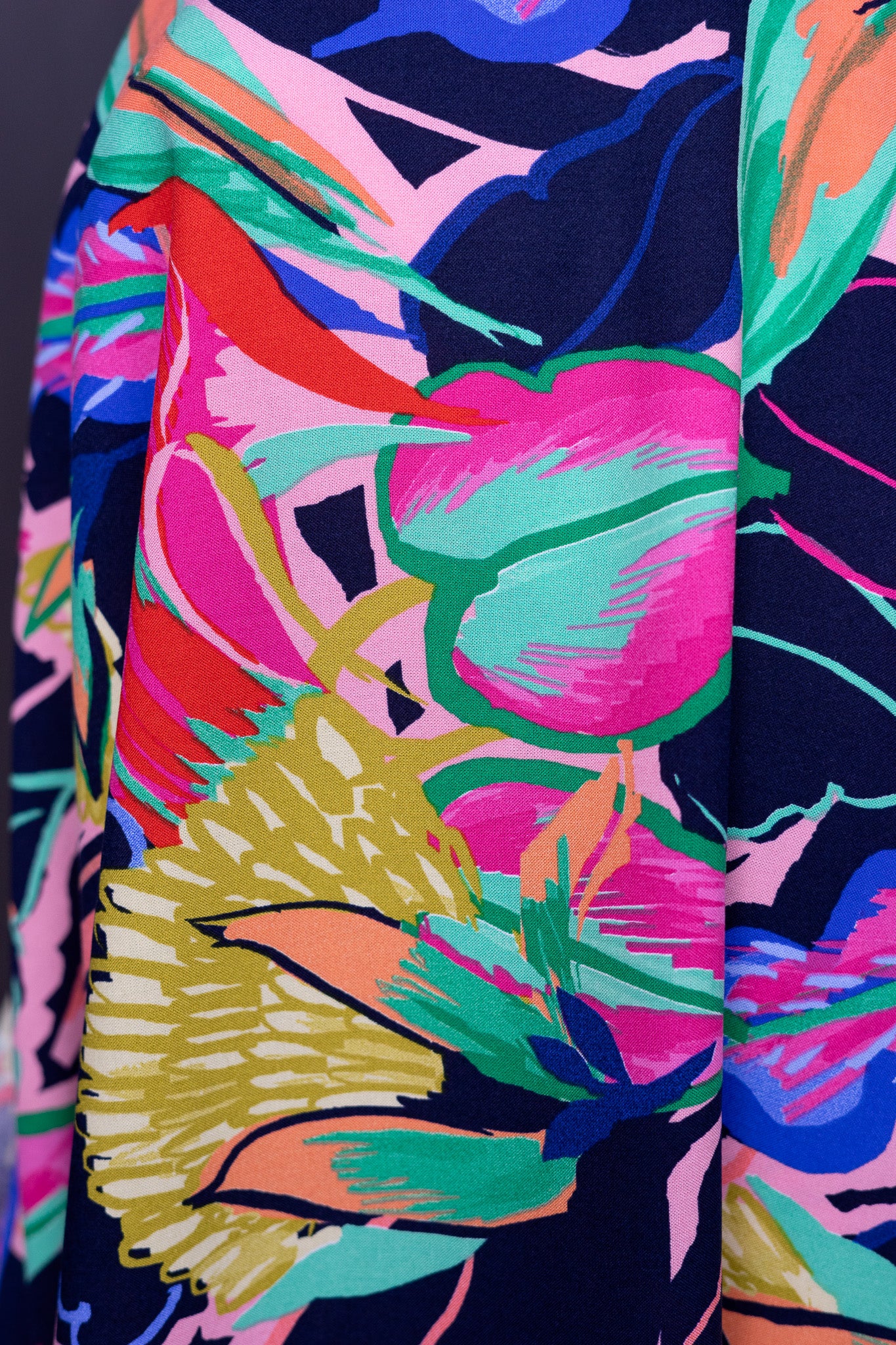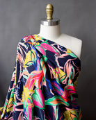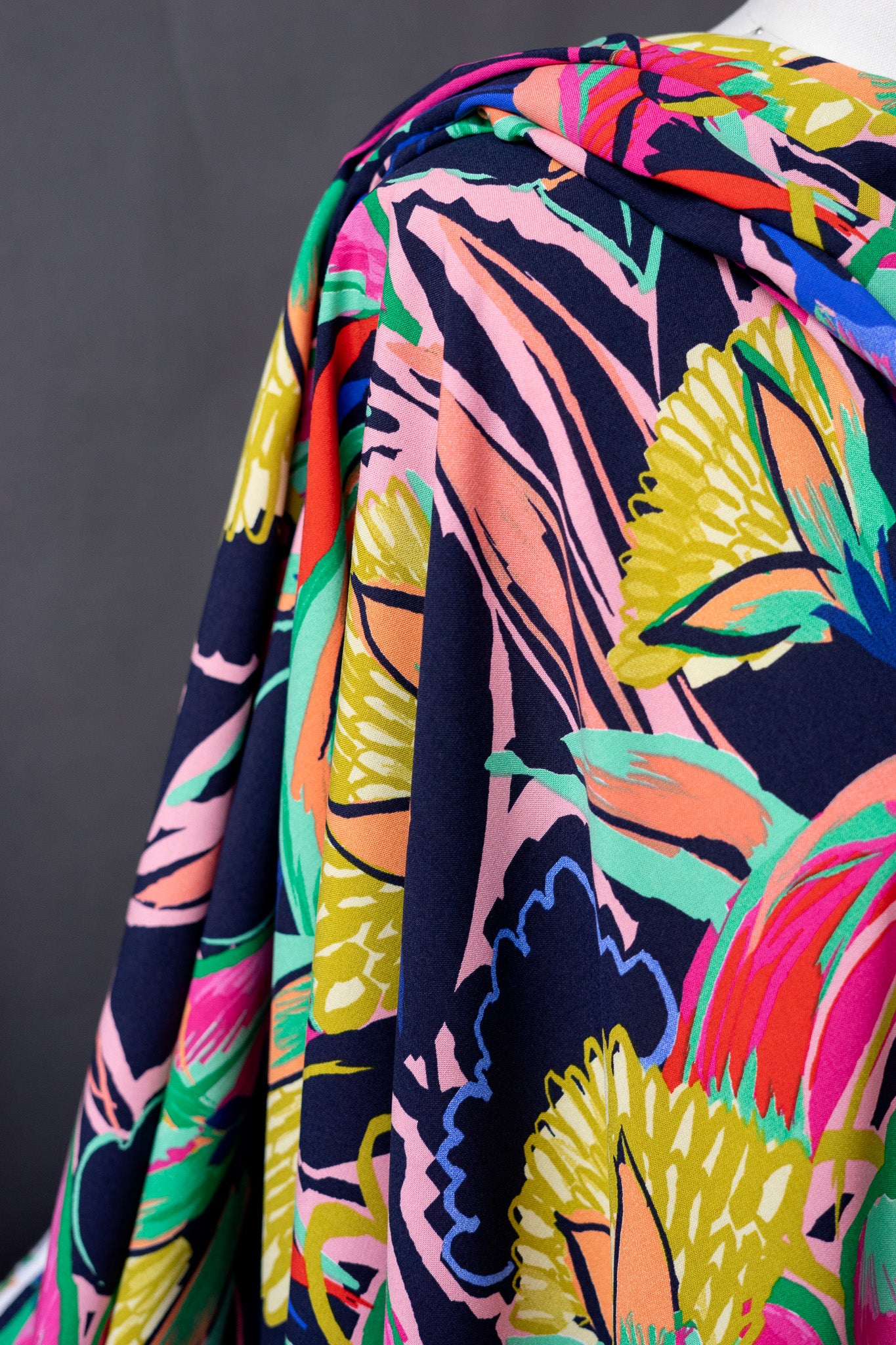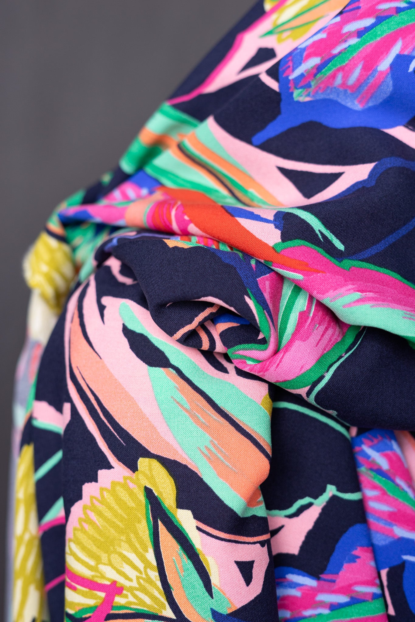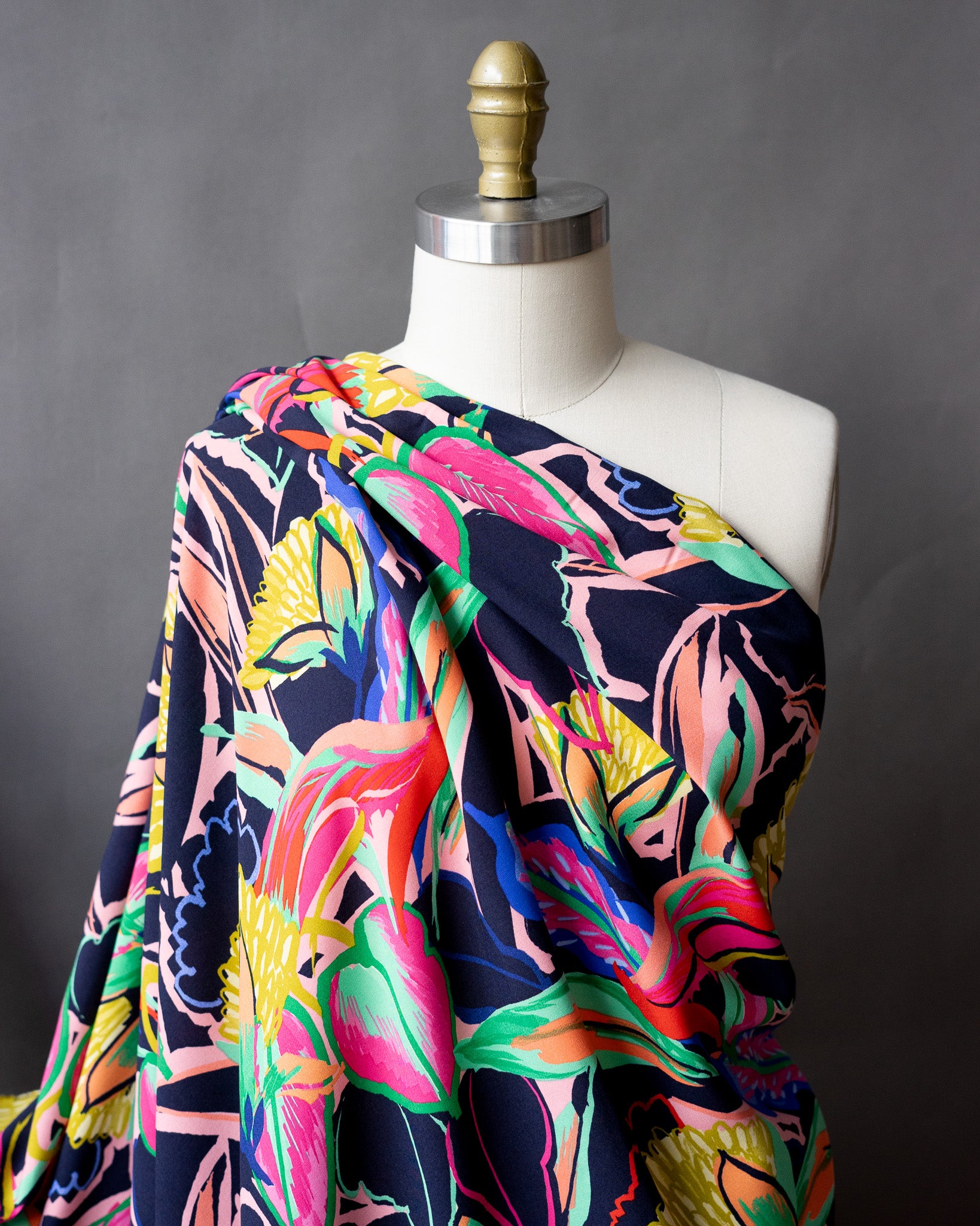 This lightweight Ecovero viscose has a bright tropical print that's perfect for your next luau. Think: wrap skirts, halter dresses, and flowing trousers.