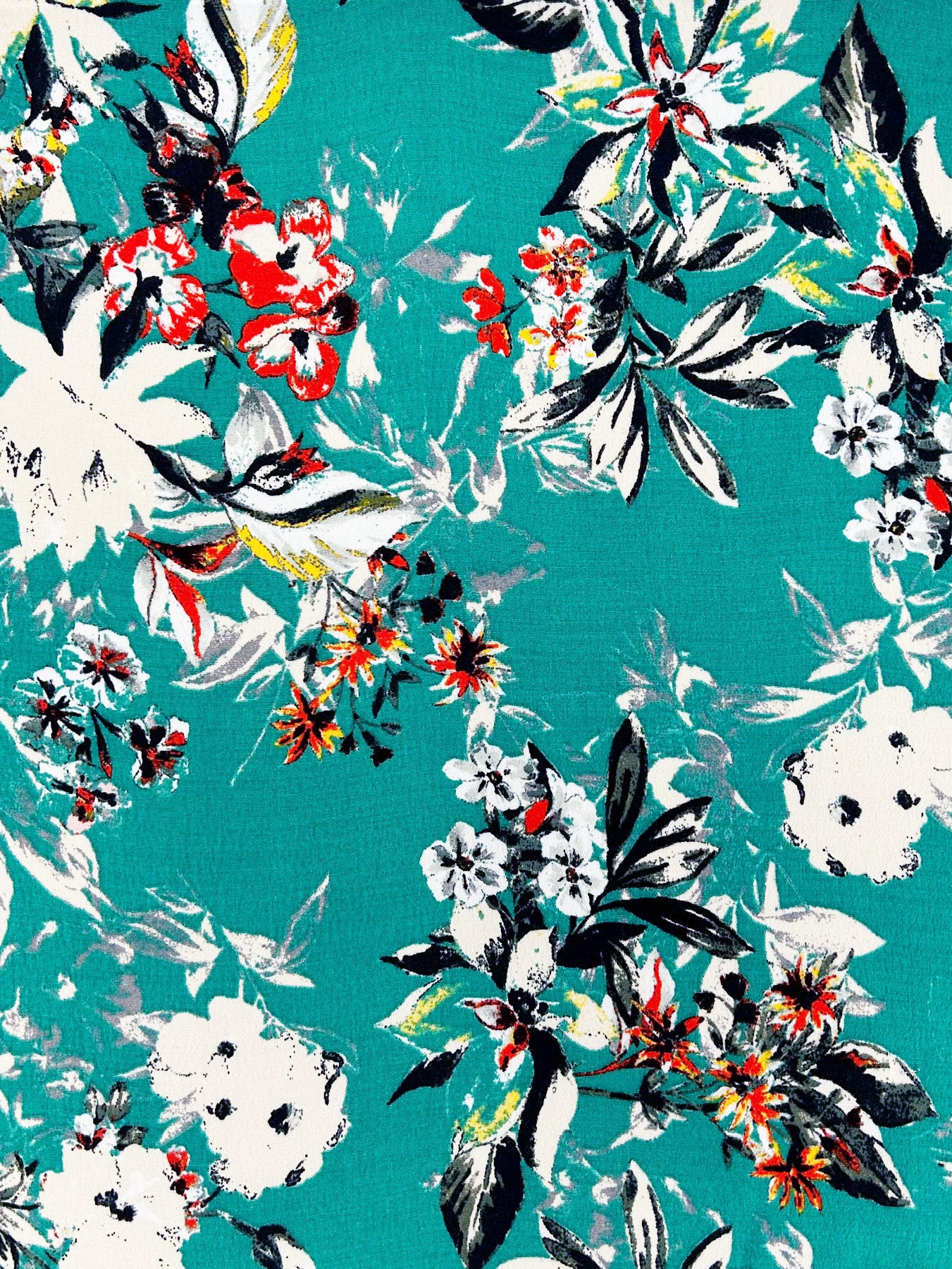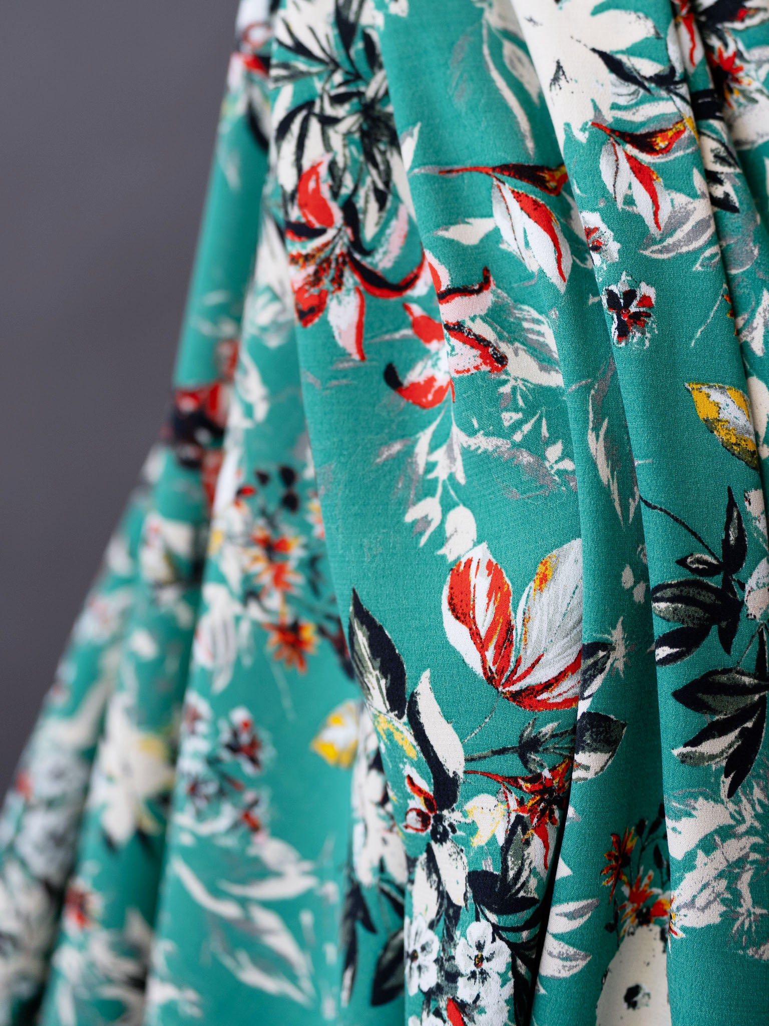 This dreamy Italian viscose crepe evokes garden parties and mint juleps. With subtle texture, lovely drape, and a matte finish, this lightweight floral is perfect for dresses, skirts, blouses, and trousers.