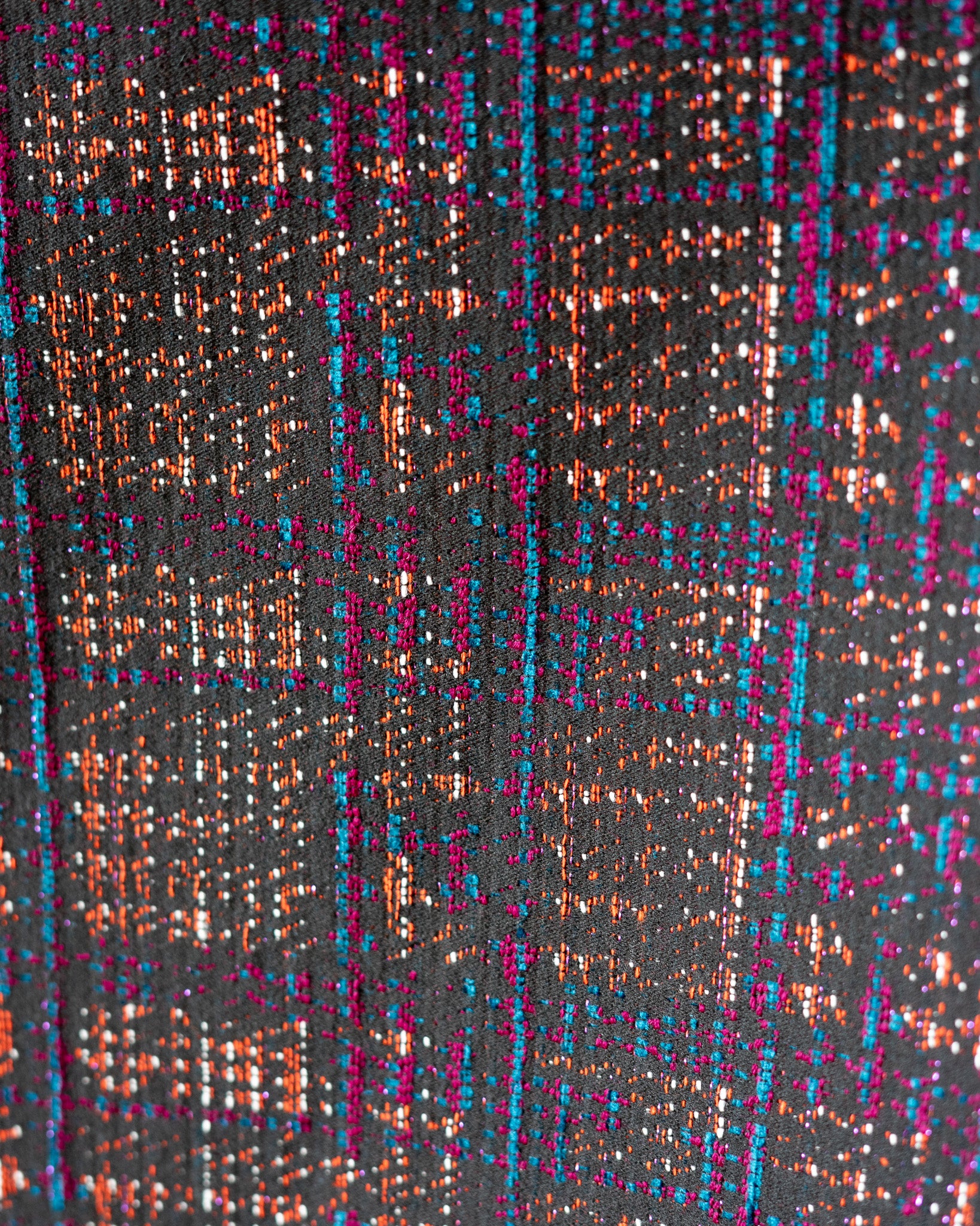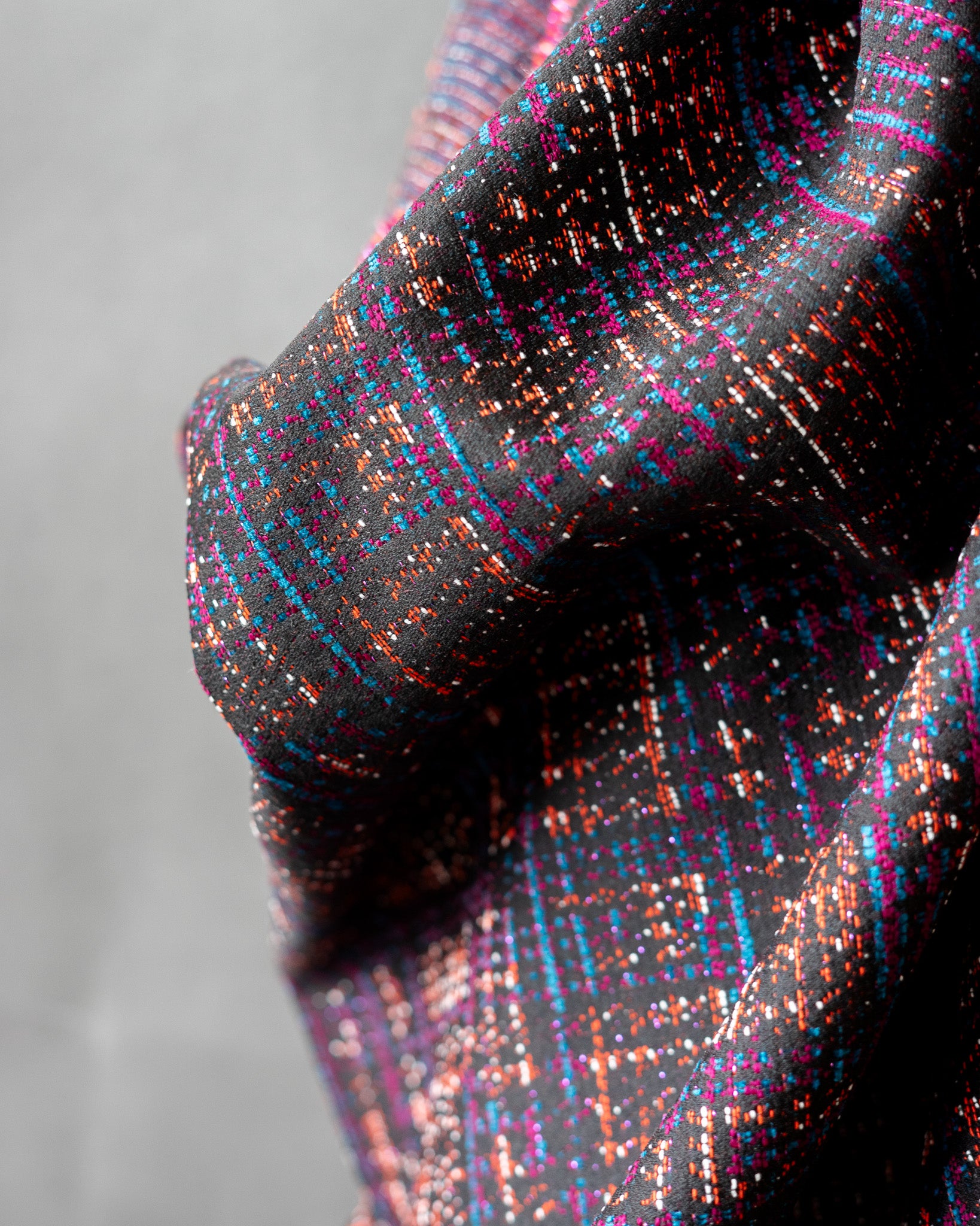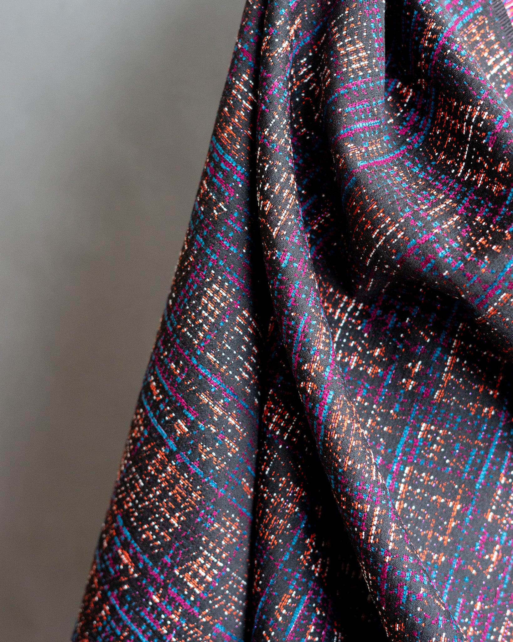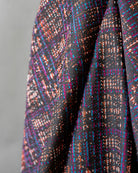 This wool blend plaid is a little bit preppy, a little bit glam. Woven with chocolate brown, cyan blue, magenta, orange, and a little bit of lurex, this wool works for everything from a riding jacket to mini skirt.