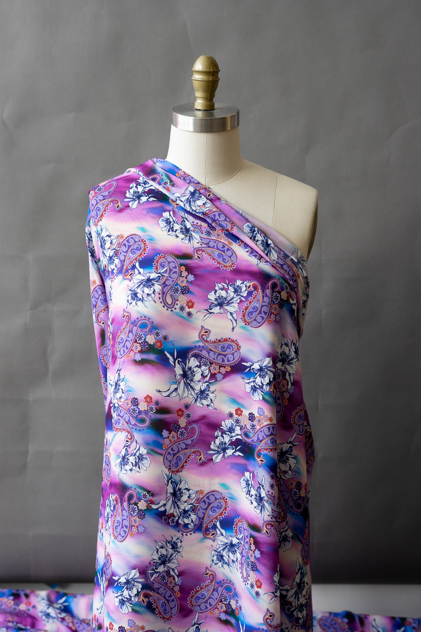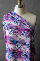 This groovy tropical print feature paisley designs and tropical blossoms over a purple gradient. It would be perfect for a beach cover-up, breezy dress, wrap skirt, or lightweight blouse.