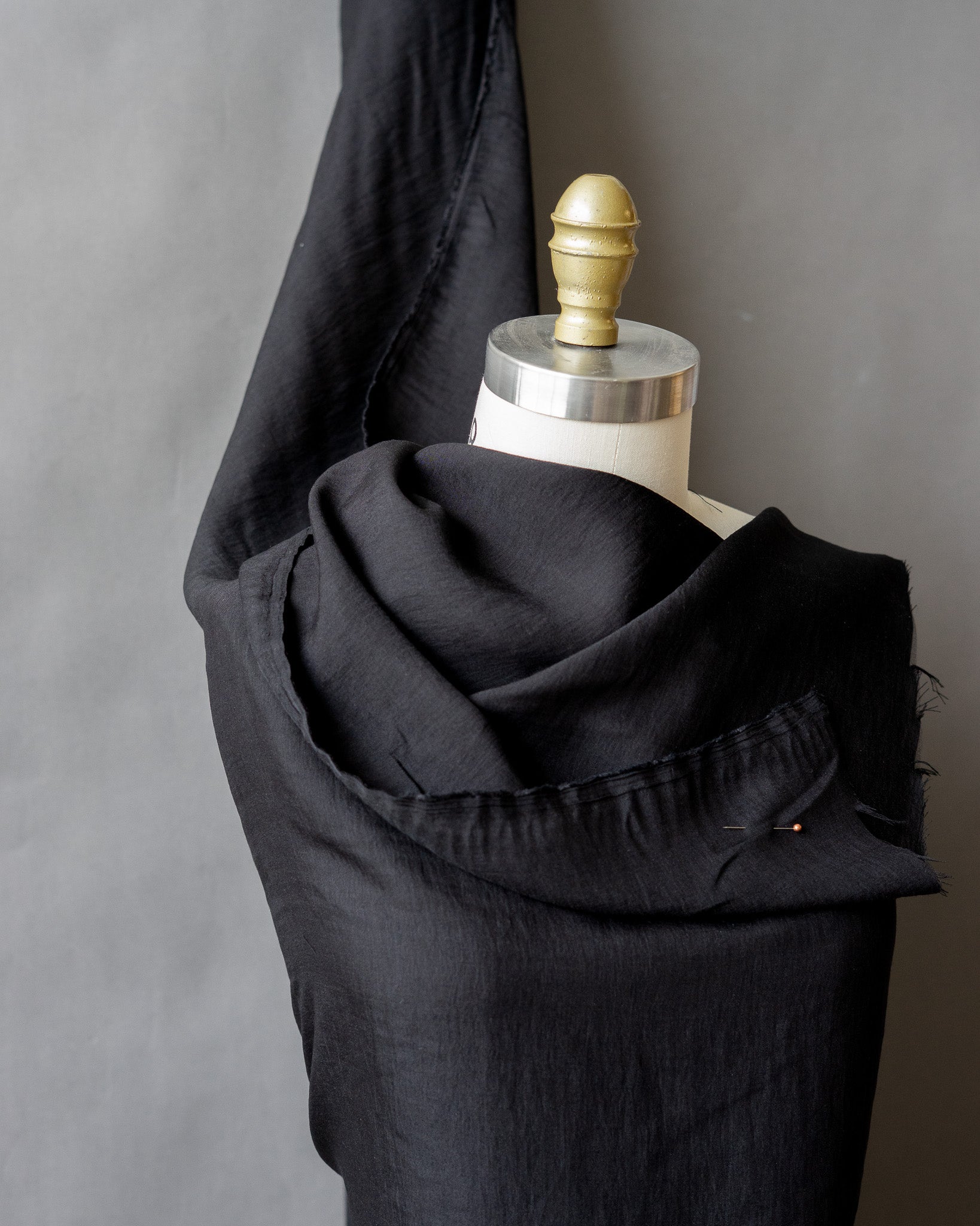 This designer deadstock black cotton voile has slight transparency and a soft drape that makes it great for lightweight shirts, dresses, and garment lining. "Deadstock" refers to surplus or discontinued fabrics from clothing brands and mills that has gone unused (and might otherwise end up in a landfill). It's a win-win: you get premium fabric at a great price, and this beautiful fabric gets a second life!