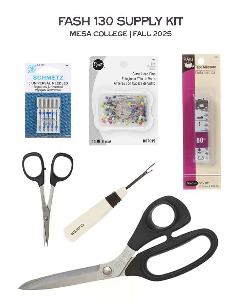 This kit includes the required supplies for San Diego Mesa College's Apparel Construction 1 (FASH130) course.