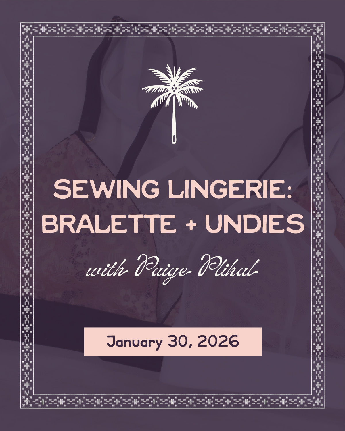 Make your own matching lingerie set in this hands-on workshop led by local sewing teacher, knitter, and dye artist Paige Plihal. You'll sew the Jordy Bralette, a classic triangle-style bralette with several styling options, along with an Emerald Erin underwear pattern of your choice. It's the perfect project for building your confidence with knits, laces, and delicate fabrics.